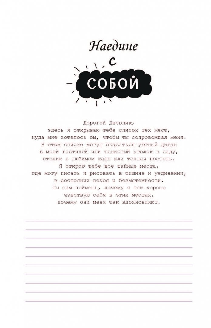 ОписаниеНеобязательно быть великим писателем, чтобы писать. Достаточно открыть этот дневник, выбрать хорошую ручку, прислушаться к себе, устроиться поудобнее и начать изливать свои мысли на бумагу. Указания и советы авторов помогут вам в этом, направляя шаг за шагом, предлагая выполнять небольшие упражнения и вписывать слова в пустые строчки, пока дневник не заполнится вашими мыслями. Оставляя на каждой странице свои слова, чувства, рисунки, вы оставляете частичку себя. Этот дневник приглашает вас совершить увлекательное путешествие, где он будет вашим верным компаньоном.Необязательно быть великим писателем, чтобы писать. Достаточно открыть этот дневник, выбрать хорошую ручку, прислушаться к себе, устроиться поудобнее и начать изливать свои мысли на бумагу. Указания и советы авторов помогут вам в этом, направляя шаг за шагом, предлагая выполнять небольшие упражнения и вписывать слова в пустые строчки, пока дневник не заполнится вашими мыслями. Оставляя на каждой странице свои слова, чувства, рисунки, вы оставляете частичку себя. Этот дневник приглашает вас совершить увлекательное путешествие, где он будет вашим верным компаньоном.