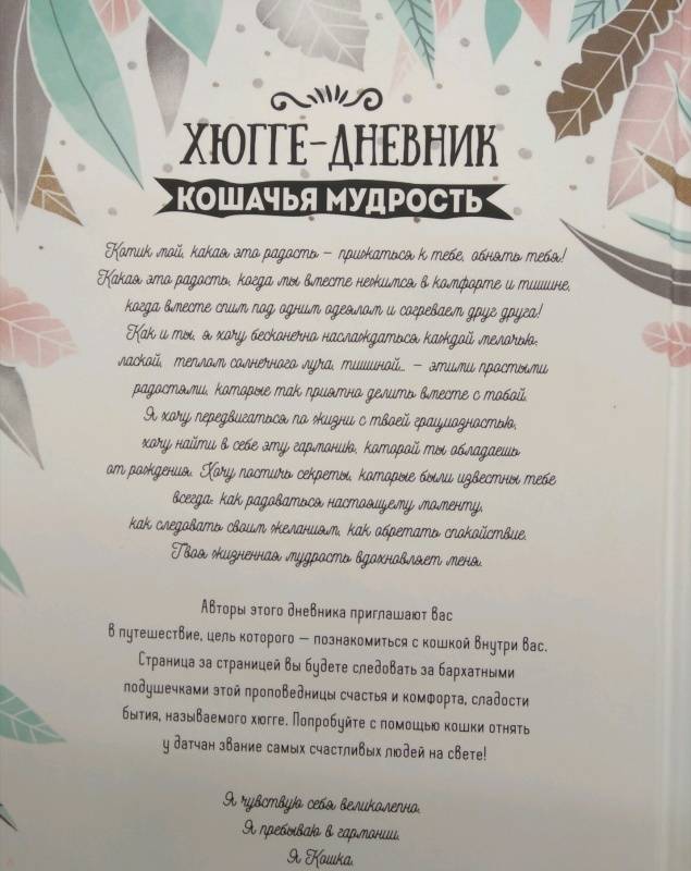 ОписаниеАвторы этого дневника приглашают вас в путешествие, цель которого - познакомиться с кошкой внутри вас. Страница за страницей вы будет следовать за бархатными подушечками этой проповедницы счастья и комфорта, сладости бытия, называемого хюгге. Попробуйте с помощью кошки отнять у датчан звание самых счастливых людей на свете!Авторы этого дневника приглашают вас в путешествие, цель которого - познакомиться с кошкой внутри вас. Страница за страницей вы будет следовать за бархатными подушечками этой проповедницы счастья и комфорта, сладости бытия, называемого хюгге. Попробуйте с помощью кошки отнять у датчан звание самых счастливых людей на свете!