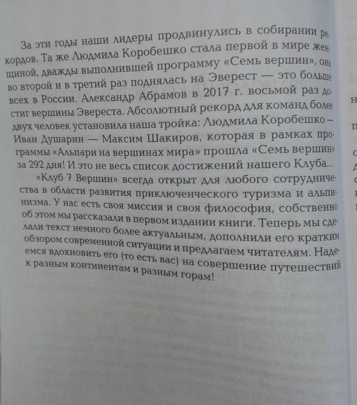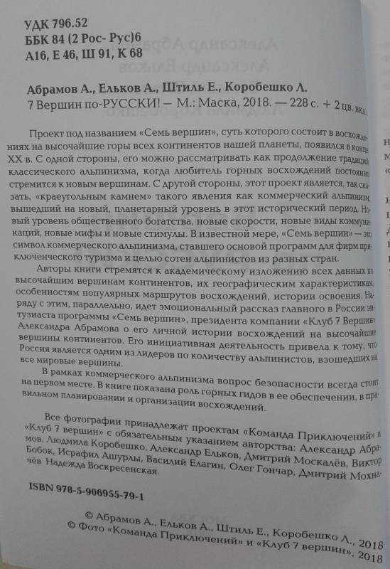 ОписаниеПроект под названием "Семь вершин", суть которого состоит в восхождениях на высочайшие горы всех континентов нашей планеты, появился в конце XX в. С одной стороны, его можно рассматривать как продолжение традиций классического альпинизма, когда любитель горных восхождений постоянно стремится к новым вершинам. С другой стороны, этот проект является, так сказать, "краеугольным камнем" такого явления как коммерческий альпинизм, вышедший на новый, планетарный уровень в этот исторический период. Новый уровень общественного богатства, новые скорости, новые виды коммуникаций, новые мифы и новые стимулы. В известной мере, "Семь вершин" - это символ коммерческого альпинизма, ставшего основой программ для фирм приключенческого туризма и целью сотен альпинистов из разных стран.Авторы книги стремятся к академическому изложению всех данных по высочайшим вершинам континентов, их географическим характеристикам, особенностям популярных маршрутов восхождений, истории освоения. Наряду с этим, параллельно, идет эмоциональный рассказ главного в России энтузиаста программы "Семь вершин", президента компании "Клуб 7 Вершин" Александра Абрамова о его личной истории восхождений на высочайшие вершины континентов. Его инициативная деятельность привела к тому, что Россия является одним из лидеров по количеству альпинистов, взошедших на все мировые вершины.В рамках коммерческого альпинизма вопрос безопасности всегда стоит на первом месте. В книге показана роль горных гидов в ее обеспечении, в правильном планировании и организации восхождений.СвернутьПроект под названием "Семь вершин", суть которого состоит в восхождениях на высочайшие горы всех континентов нашей планеты, появился в конце XX в. С одной стороны, его можно рассматривать как продолжение традиций классического альпинизма, когда любитель горных восхождений постоянно стремится к новым вершинам. С другой стороны, этот проект является, так сказать, "краеугольным камнем" такого явления как коммерческий альпинизм, вышедший на новый, планетарный уровень в этот исторический период. Новый уровень общественного богатства, новые скорости, новые виды коммуникаций, новые мифы и новые стимулы. В известной мере, "Семь вершин" - это символ коммерческого альпинизма, ставшего основой программ для фирм приключенческого туризма и целью сотен альпинистов из разных стран.Авторы книги стремятся к академическому изложению всех данных по высочайшим вершинам континентов, их географическим характеристикам, особенностям популярных маршрутов восхождений, истории освоения. Наряду с этим, параллельно, идет эмоциональный рассказ главного в России энтузиаста программы "Семь вершин", президента компании "Клуб 7 Вершин" Александра Абрамова о его личной истории восхождений на высочайшие вершины континентов. Его инициативная деятельность привела к тому, что Россия является одним из лидеров по количеству альпинистов, взошедших на все мировые вершины.В рамках коммерческого альпинизма вопрос безопасности всегда стоит на первом месте. В книге показана роль горных гидов в ее обеспечении, в правильном планировании и организации восхождений.СвернутьСвернуть