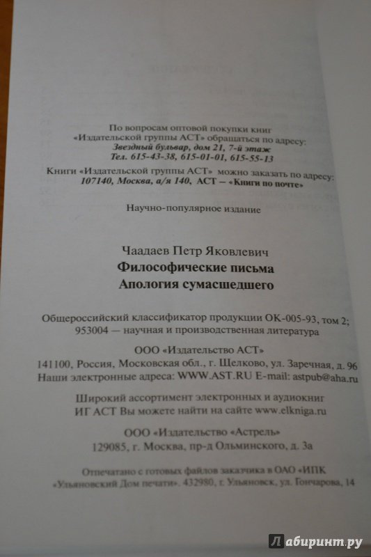 ---Петр Чаадаев: Философические письма. Апология сумасшедшегоЭЗОТЕРИКА. ПАРАПСИХОЛОГИЯ. ТАЙНЫ.БИОГРАФИИ и МЕМУАРЫИСТОРИЯ и ПОЛИТИКАФЭНТЕЗИ и ФАНТАСТИКАМЕДИЦИНА и ПСИХОЛОГИЯ ЭКОНОМИКА. БИЗНЕС. МАРКЕТИНГПУТЕШЕСТВИЕ и ДОСУГКНИГИ НА ДРУГИХ ЯЗЫКАХКНИГИ ДЛЯ ДЕТЕЙУЧЕБНАЯ, МЕТОДИЧЕСКАЯ ЛИТЕРАТУРА и СЛОВАРИТЕХНИКА и НАУКАХУДОЖЕСТВЕННАЯ ЛИТЕРАТУРАРЕЛИГИЯ и ФИЛОСОФИЯПЕРИОДИЧЕСКИЕ ИЗДАНИЯМЕДИЦИНА и ПСИХОЛОГИЯНАШ ИЗРАИЛЬ