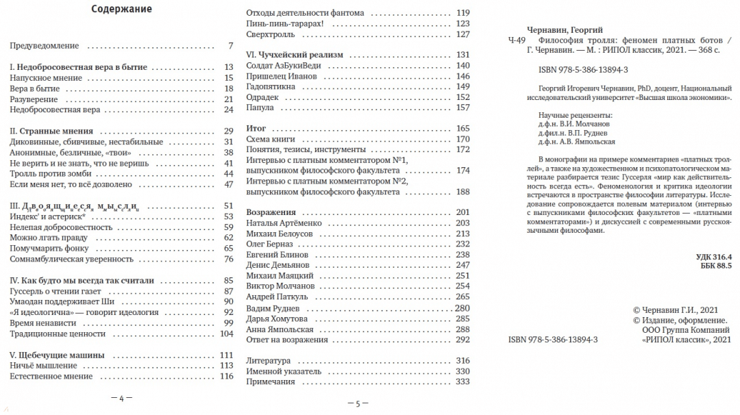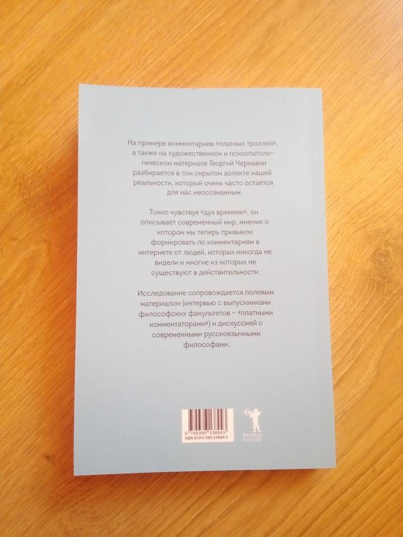 ОписаниеНа примере комментариев "платных троллей", а также на художественном и психопатологическом материале Георгий Чернавин разбирается в том скрытом аспекте нашей реальности, который очень часто остается для нас неосознанным.Тонко чувствуя "дух времени", он описывает современный мир, мнение о котором мы теперь привыкли формировать по комментариям в интернете от людей, которых никогда не видели и многие из которых не существуют в действительности.Исследование сопровождается полевым материалом (интервью с выпускниками философских факультетов - "платными комментаторами") и дискуссией с современными русскоязычными философами.На примере комментариев "платных троллей", а также на художественном и психопатологическом материале Георгий Чернавин разбирается в том скрытом аспекте нашей реальности, который очень часто остается для нас неосознанным.Тонко чувствуя "дух времени", он описывает современный мир, мнение о котором мы теперь привыкли формировать по комментариям в интернете от людей, которых никогда не видели и многие из которых не существуют в действительности.Исследование сопровождается полевым материалом (интервью с выпускниками философских факультетов - "платными комментаторами") и дискуссией с современными русскоязычными философами.