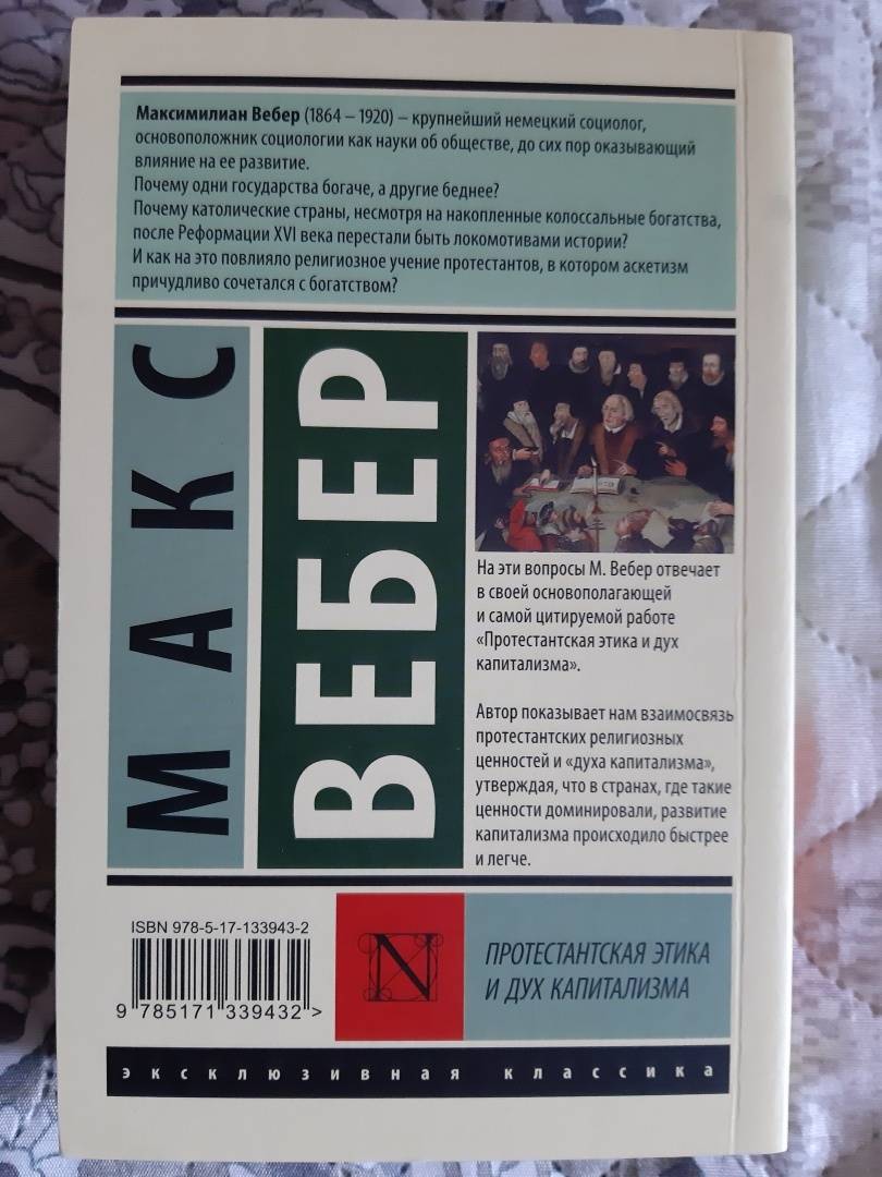 ОписаниеМаксимилиан Вебер (1864 - 1920) - крупнейший немецкий социолог, основоположник социологии как науки об обществе, до сих пор оказывающий влияние на ее развитие.Почему одни государства богаче, а другие беднее?Почему католические страны, несмотря на накопленные колоссальные богатства, после Реформации XVI века престали быть локомотивами истории? И как на это повлияло религиозное учение протестантов, в котором аскетизм причудливо сочетался с богатством?На эти вопросы М. Вебер отвечает в своей основополагающей и самой цитируемой работе "Протестантская этика и дух капитализма".Автор показывает нам взаимосвязь протестантских религиозных ценностей и "духа капитализма", утверждая, что в странах, где такие ценности доминировали, развитие капитализма происходило быстрее и легче.Максимилиан Вебер (1864 - 1920) - крупнейший немецкий социолог, основоположник социологии как науки об обществе, до сих пор оказывающий влияние на ее развитие.Почему одни государства богаче, а другие беднее?Почему католические страны, несмотря на накопленные колоссальные богатства, после Реформации XVI века престали быть локомотивами истории? И как на это повлияло религиозное учение протестантов, в котором аскетизм причудливо сочетался с богатством?На эти вопросы М. Вебер отвечает в своей основополагающей и самой цитируемой работе "Протестантская этика и дух капитализма".Автор показывает нам взаимосвязь протестантских религиозных ценностей и "духа капитализма", утверждая, что в странах, где такие ценности доминировали, развитие капитализма происходило быстрее и легче.