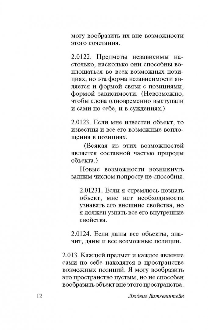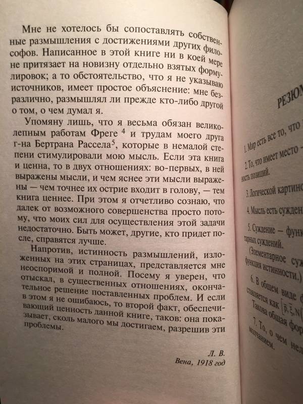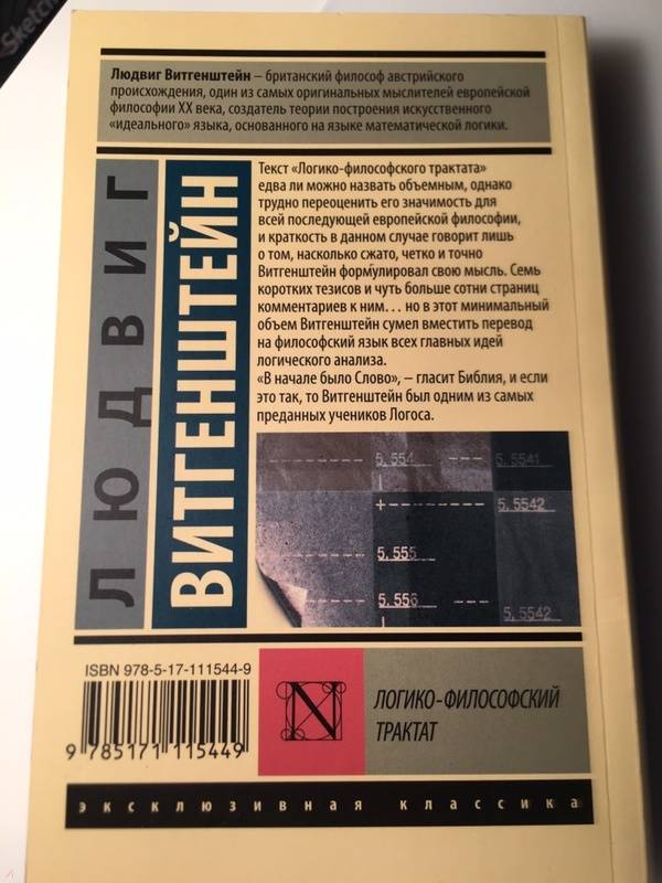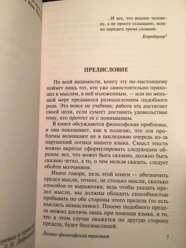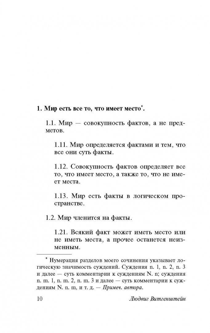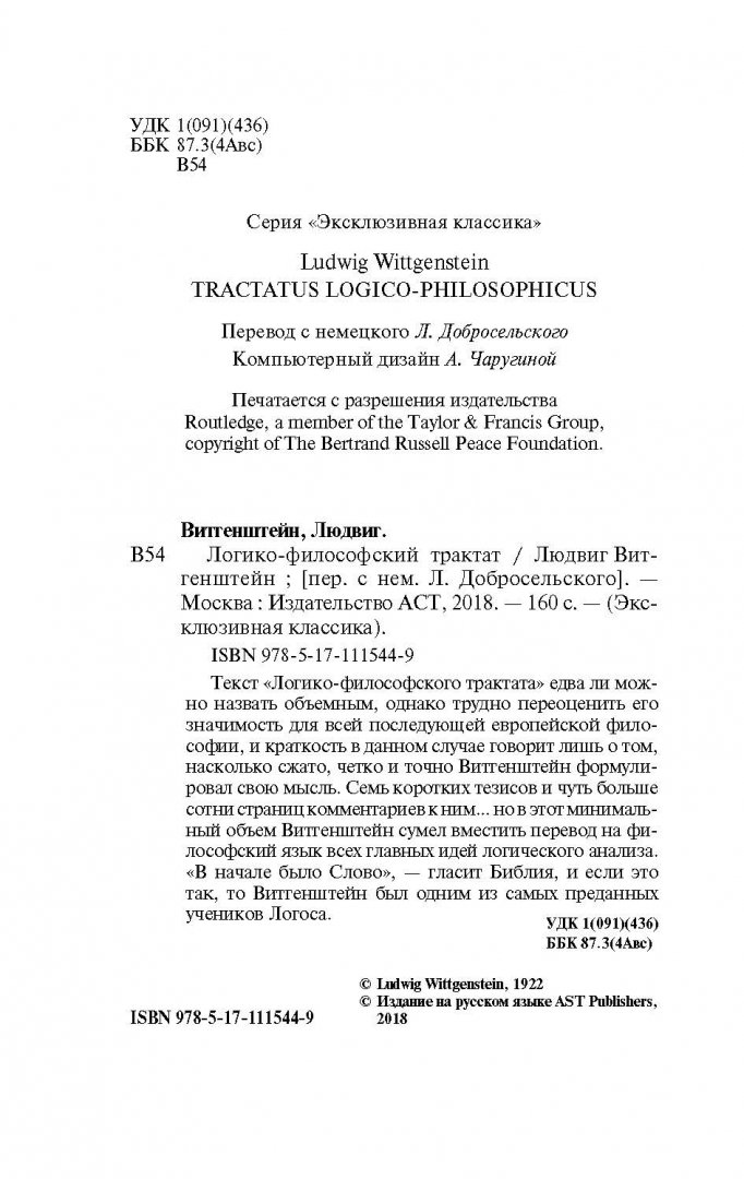 ОписаниеТекст "Логико-философского трактата" едва ли можно назвать объемным, однако трудно переоценить его значимость для всей последующей европейской философии, и краткость в данном случае говорит лишь о том, насколько сжато, четко и точно Витгенштейн формулировал свою мысль. Семь коротких тезисов и чуть больше сотни страниц комментариев к ним… но в этот минимальный объем Витгенштейн сумел вместить перевод на философский язык всех главных идей логического анализа."В начале было Слово", - гласит Библия, и если это так, то Витгенштейн был одним из самых преданных учеников Логоса.Текст "Логико-философского трактата" едва ли можно назвать объемным, однако трудно переоценить его значимость для всей последующей европейской философии, и краткость в данном случае говорит лишь о том, насколько сжато, четко и точно Витгенштейн формулировал свою мысль. Семь коротких тезисов и чуть больше сотни страниц комментариев к ним… но в этот минимальный объем Витгенштейн сумел вместить перевод на философский язык всех главных идей логического анализа."В начале было Слово", - гласит Библия, и если это так, то Витгенштейн был одним из самых преданных учеников Логоса.