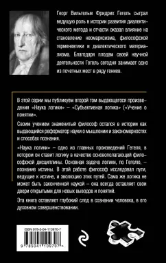 ОписаниеГеорг Гегель - один из основоположников немецкой классической философии, создатель учения, построенного на принципах "абсолютного идеализма", диалектики, системности, историзма. Важнейшее место в его научной деятельности занимает произведение "Наука логики", в котором философ определяет основную задачу логики, исследует пути, ведущие к истине, а также развитие этих путей. Во второй том мы включили третью часть знаменитого труда – "Учение о понятии", в которую вошли три главных раздела: "Субъективность", "Объективность", "Идея".Георг Гегель - один из основоположников немецкой классической философии, создатель учения, построенного на принципах "абсолютного идеализма", диалектики, системности, историзма. Важнейшее место в его научной деятельности занимает произведение "Наука логики", в котором философ определяет основную задачу логики, исследует пути, ведущие к истине, а также развитие этих путей. Во второй том мы включили третью часть знаменитого труда – "Учение о понятии", в которую вошли три главных раздела: "Субъективность", "Объективность", "Идея".