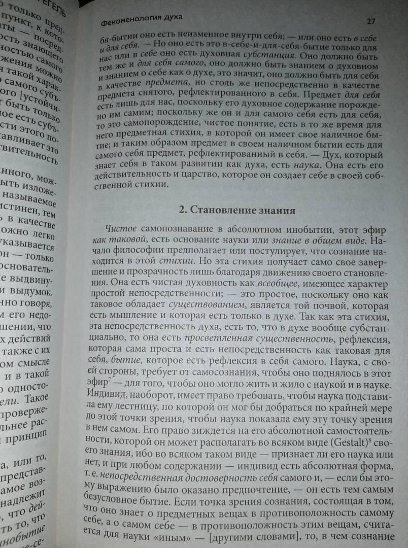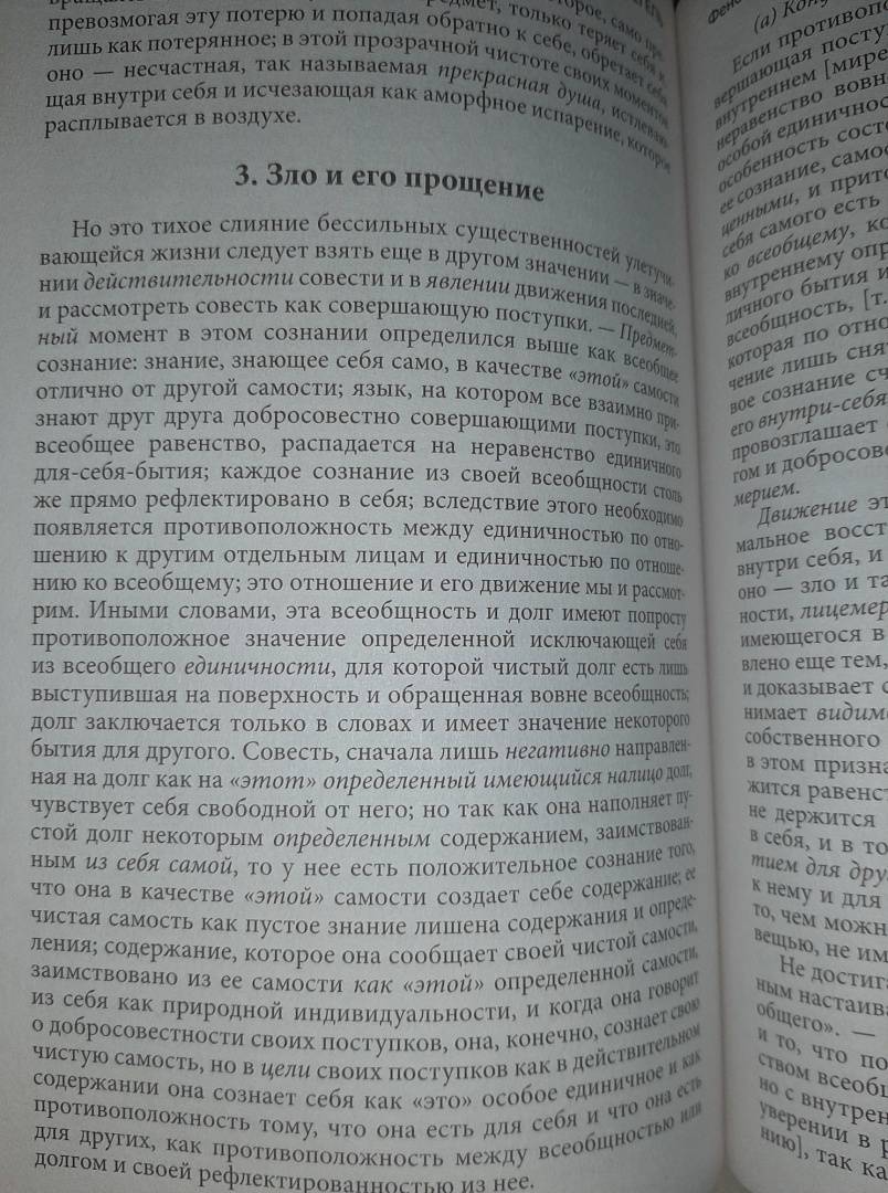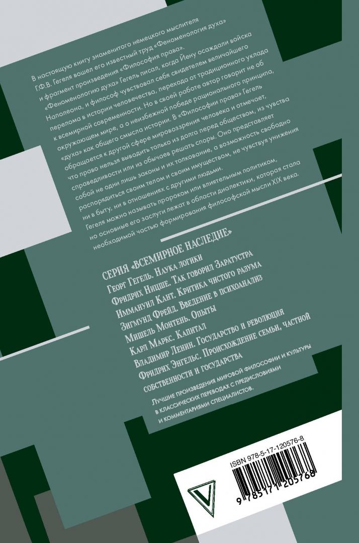 ОписаниеВ настоящую книгу знаменитого немецкого мыслителя Г.В.Ф. Гегеля вошел его известный труд "Феноменология духа" и фрагмент произведения "Философия права". "Феноменологию духа" Гегель писал, когда Йену осаждали войска Наполеона, и философ чувствовал себя свидетелем величайшего перелома в истории человечества, перехода от традиционного уклада к всемирной современности. Но в своей работе автор говорит не об окружающем мире, а о неизбежной победе рационального принципа, "духа" как общего смысла истории. В "Философии права" Гегель обращается к другой сфере мировоззрения человека и говорит о том, что право нельзя выводить только из долга перед обществом, из чувства справедливости или из обычаев решать споры. Оно представляет собой не одни лишь законы и их толкование, а возможность свободно распорядиться своим телом и своим имуществом, не чувствуя унижения ни в быту, ни в отношениях с другими людьми.Гегеля можно называть пророком или влиятельным политиком, но основные его заслуги лежат в области диалектики, которая стала необходимой частью формирования философской мысли XIX века.СвернутьВ настоящую книгу знаменитого немецкого мыслителя Г.В.Ф. Гегеля вошел его известный труд "Феноменология духа" и фрагмент произведения "Философия права". "Феноменологию духа" Гегель писал, когда Йену осаждали войска Наполеона, и философ чувствовал себя свидетелем величайшего перелома в истории человечества, перехода от традиционного уклада к всемирной современности. Но в своей работе автор говорит не об окружающем мире, а о неизбежной победе рационального принципа, "духа" как общего смысла истории. В "Философии права" Гегель обращается к другой сфере мировоззрения человека и говорит о том, что право нельзя выводить только из долга перед обществом, из чувства справедливости или из обычаев решать споры. Оно представляет собой не одни лишь законы и их толкование, а возможность свободно распорядиться своим телом и своим имуществом, не чувствуя унижения ни в быту, ни в отношениях с другими людьми.Гегеля можно называть пророком или влиятельным политиком, но основные его заслуги лежат в области диалектики, которая стала необходимой частью формирования философской мысли XIX века.СвернутьСвернуть