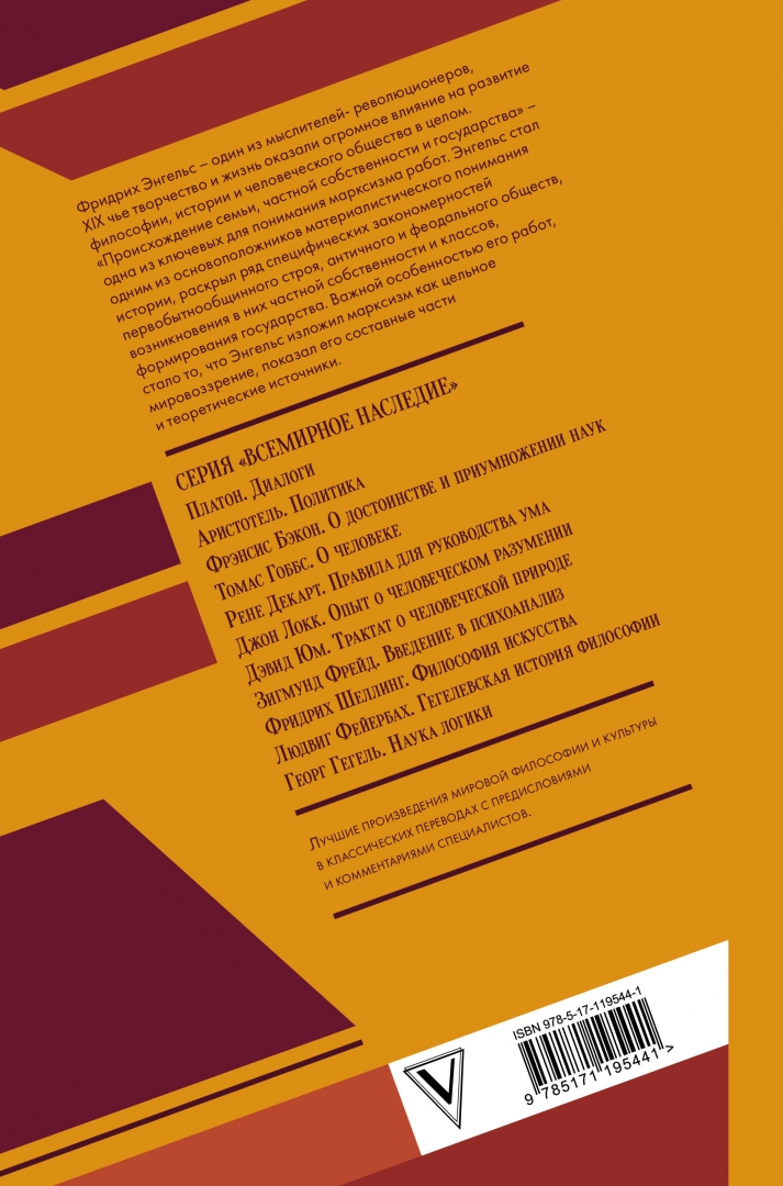 ОписаниеФридрих Энгельс – один из мыслителей-революционеров XIX века, чье творчество и жизнь оказали огромное влияние на развитие философии, истории и человеческого общества в целом. «Происхождение семьи, частной собственности и государства» – одна из самых важных его работ. Энгельс стал одним из основоположников материалистического понимания истории, раскрыл ряд специфических закономерностей первобытнообщинного строя, античного и феодального обществ, возникновения в них частной собственности и классов, формирования государства. Важной особенностью его работ стало то, что Энгельс изложил марксизм как цельное мировоззрение, показал его составные части и теоретические источники.Фридрих Энгельс – один из мыслителей-революционеров XIX века, чье творчество и жизнь оказали огромное влияние на развитие философии, истории и человеческого общества в целом. «Происхождение семьи, частной собственности и государства» – одна из самых важных его работ. Энгельс стал одним из основоположников материалистического понимания истории, раскрыл ряд специфических закономерностей первобытнообщинного строя, античного и феодального обществ, возникновения в них частной собственности и классов, формирования государства. Важной особенностью его работ стало то, что Энгельс изложил марксизм как цельное мировоззрение, показал его составные части и теоретические источники.
