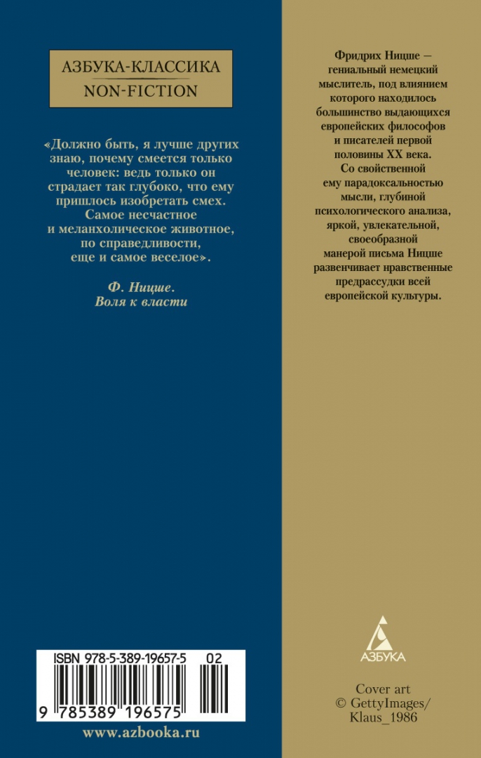 Объем, стр. 448 ISBN 978-5-389-19657-5 Автор Ницше Фридрих Вильгельм, Герцык Е., Соловьева Е., Рачинский Г. А. Переводчик Герцык Е., Соловьева Е., Рачинский Г. А. Серия Азбука-Классика. Non-Fiction Язык Русский Год издания книги 2023 Тип обложки Мягкий переплет Иллюстрации Без иллюстраций Вес, г 218г Размеры 180х115х20 мм - Отзывы