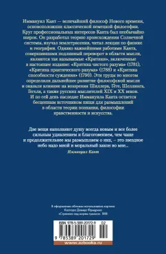 ОписаниеИммануил Кант — величайший из философов Нового времени, основоположник классической немецкой философии. Круг профессиональных интересов Канта был необычайно широк. Он разработал теорию происхождения солнечной системы, изучал землетрясения, читал лекции по физике и географии. Однако важнейшими работами Канта, совершившими подлинный переворот в области мысли, являются так называемые «Критики», включенные в настоящее издание: «Критика чистого разума» (1781), «Критика практического разума» (1788) и «Критика способности суждения» (1790). Эти труды во многом определили дальнейшее развитие философской мысли и оказали влияние на воззрения Шиллера, Гёте, Шеллинга, Гегеля, а также русских мыслителей XIX и XX веков; и по сей день наследие Иммануила Канта остается бесценным источником пищи для размышлений в области теории познания, философии нравственности и искусства.Иммануил Кант — величайший из философов Нового времени, основоположник классической немецкой философии. Круг профессиональных интересов Канта был необычайно широк. Он разработал теорию происхождения солнечной системы, изучал землетрясения, читал лекции по физике и географии. Однако важнейшими работами Канта, совершившими подлинный переворот в области мысли, являются так называемые «Критики», включенные в настоящее издание: «Критика чистого разума» (1781), «Критика практического разума» (1788) и «Критика способности суждения» (1790). Эти труды во многом определили дальнейшее развитие философской мысли и оказали влияние на воззрения Шиллера, Гёте, Шеллинга, Гегеля, а также русских мыслителей XIX и XX веков; и по сей день наследие Иммануила Канта остается бесценным источником пищи для размышлений в области теории познания, философии нравственности и искусства.