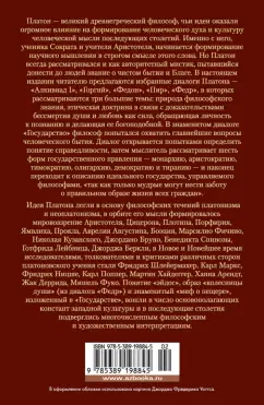 ОписаниеПлатон — великий древнегреческий философ, чьи идеи оказали огромное влияние на формирование человеческого духа и культуру человеческой мысли последующих столетий. Именно с него, ученика Сократа и учителя Аристотеля, начинается формирование научного мышления в строгом смысле этого слова. Но Платон всегда рассматривался и как авторитетный мистик, пытавшийся донести до людей знание о чистом бытии и Благе. В настоящем издании читателю предлагаются избранные диалоги Платона — «Алкивиад I», «Горгий», «Федон», «Пир», «Федр», в которых рассматриваются три большие темы: природа философского знания, этическая доктрина в связи с доказательствами бессмертия души и любовь как сила, обращающая личность к познанию и делающая ее богоподобной. В знаменитом диалоге «Государство» философ попытался охватить главнейшие вопросы человеческого бытия. Диалог открывается попытками определить понятие справедливости, затем мыслитель рассматривает шесть форм государственного правления — монархию, аристократию, тимократию, олигархию, демократию и тиранию — и наконец переходит к описанию идеального государства, управляемого философами, «так как только мудрые могут нести заботу о правильном образе жизни всех граждан».СвернутьПлатон — великий древнегреческий философ, чьи идеи оказали огромное влияние на формирование человеческого духа и культуру человеческой мысли последующих столетий. Именно с него, ученика Сократа и учителя Аристотеля, начинается формирование научного мышления в строгом смысле этого слова. Но Платон всегда рассматривался и как авторитетный мистик, пытавшийся донести до людей знание о чистом бытии и Благе. В настоящем издании читателю предлагаются избранные диалоги Платона — «Алкивиад I», «Горгий», «Федон», «Пир», «Федр», в которых рассматриваются три большие темы: природа философского знания, этическая доктрина в связи с доказательствами бессмертия души и любовь как сила, обращающая личность к познанию и делающая ее богоподобной. В знаменитом диалоге «Государство» философ попытался охватить главнейшие вопросы человеческого бытия. Диалог открывается попытками определить понятие справедливости, затем мыслитель рассматривает шесть форм государственного правления — монархию, аристократию, тимократию, олигархию, демократию и тиранию — и наконец переходит к описанию идеального государства, управляемого философами, «так как только мудрые могут нести заботу о правильном образе жизни всех граждан».СвернутьСвернуть