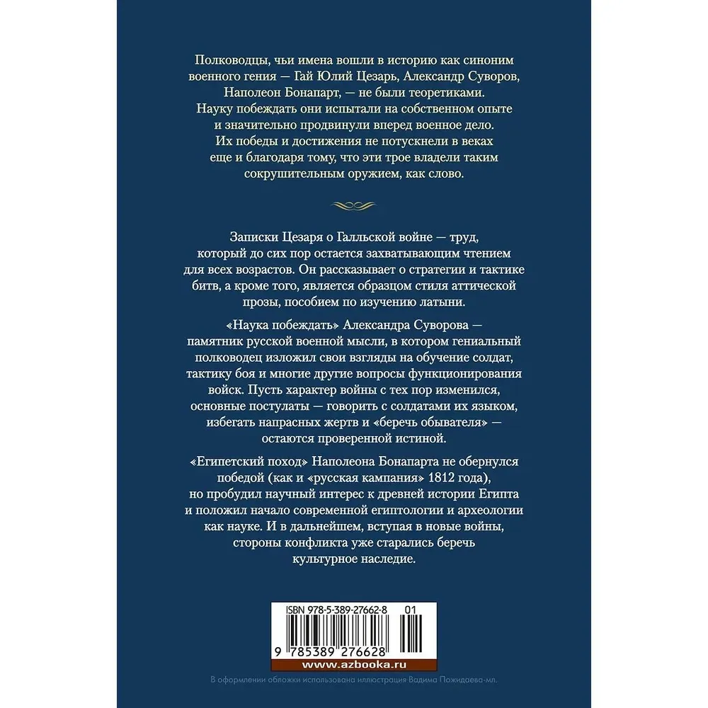 ОписаниеПолководцы, чьи имена вошли в историю как синоним военного гения, — Гай Юлий Цезарь, Александр Суворов, Наполеон Бонапарт — не были теоретиками. Науку побеждать они испытали на собственном опыте и значительно продвинули вперед военное дело. Их победы и достижения не потускнели в веках еще и благодаря тому, что эти трое владели таким сокрушительным оружием, как слово.Записки Цезаря о Галльской войне — труд, который до сих пор остается захватывающим чтением для всех возрастов. Он рассказывает о стратегии и тактике битв, а кроме того, является образцом стиля аттической прозы, пособием по изучению латыни.«Наука побеждать» Александра Суворова — памятник русской военной мысли, в котором гениальный полководец изложил свои взгляды на обучение солдат, тактику боя и многие другие вопросы функционирования войск. Пусть характер войны с тех пор изменился, основные постулаты — говорить с солдатами их языком, избегать напрасных жертв и «беречь обывателя» — остаются проверенной истиной.«Египетский поход» Наполеона Бонапарта не обернулся победой (как и «русская кампания» 1812 года), но пробудил научный интерес к древней истории Египта и положил начало современной египтологии и археологии как науке. И в дальнейшем, вступая в новые войны, стороны конфликта уже старались беречь культурное наследие.