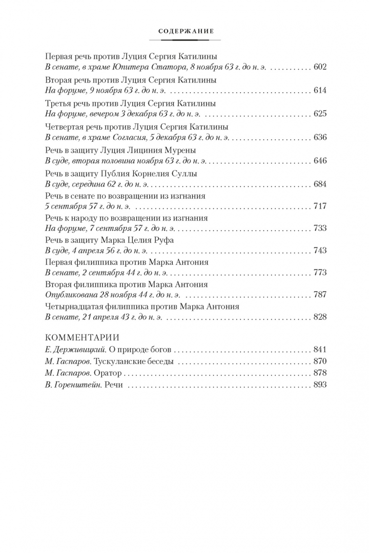В сборник вошли избранные речи Цицерона, в том числе прославленный цикл катилинарий и самые яркие филиппики; философский трактат «О природе богов» — умозрительная полемика эпикурейцев, академиков и стоиков об устройстве мироздания; трактат «Тускуланские беседы» — воображаемые диспуты о возможности счастливой жизни; и трактат «Оратор», в котором излагаются общие принципы риторического мастерства.СвернутьВыдающийся политик-идеалист, добросовестный государственный деятель, непримиримый борец с тиранией и коррупцией, глубокий теоретик риторики и великолепный оратор, гибкий мыслитель, эрудит, близкий к стоикам философ и вдумчивый писатель, на многие столетия ставший законодателем слова и стиля, — Марк Туллий Цицерон (106 г. до н. э. — 43 г. до н. э.) был фигурой неизменно блистательной, временами трагической, но вдохновляющей даже в самые черные периоды своей политической и личной биографии. Наследие Цицерона веками служило европейцам совершенным образцом выразительной точности и богатейшим источником знаний об истории Древнего Рима. Даже спустя два тысячелетия Цицерон остается актуальным, и не только как исторический источник. На материале его трактатов мы по сей день учимся стройности и широте мышления, а на его речах — принципам ведения дискуссии и грамотной аргументации: навыки, особенно полезные сейчас, когда все дискутируют со всеми, порой не слыша ни оппонентов, ни даже себя.