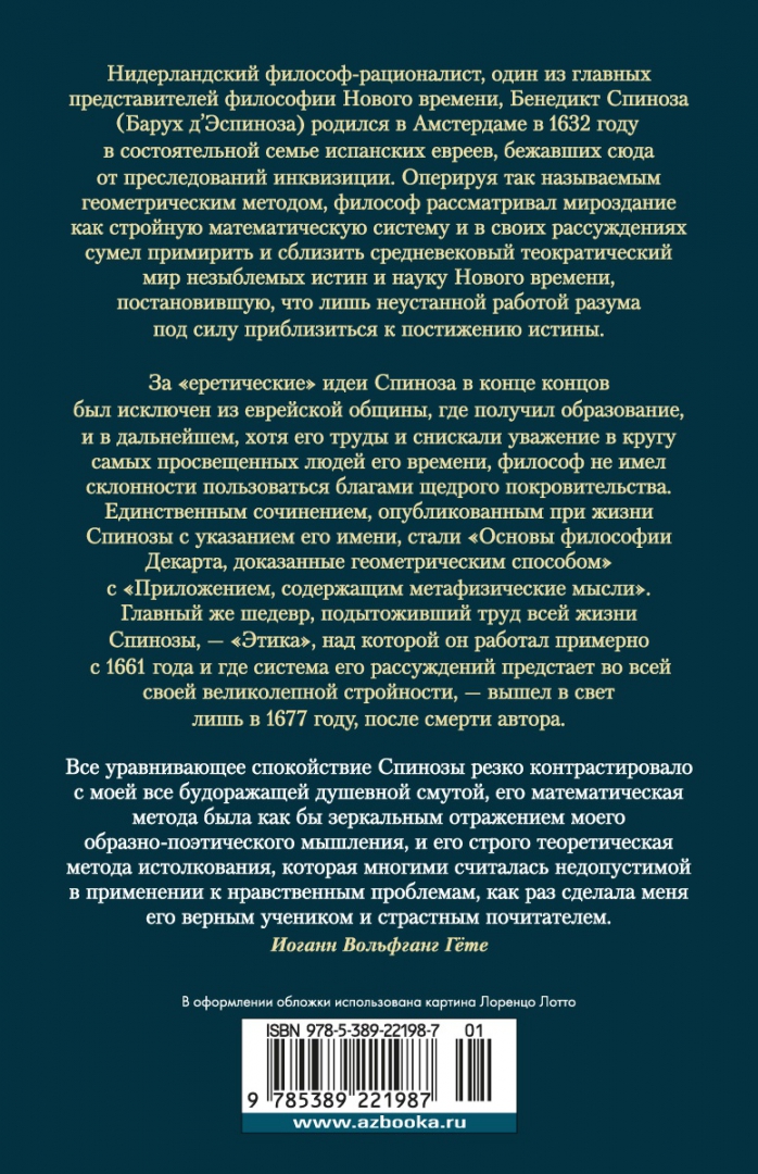 ОписаниеНидерландский философ-рационалист, один из главных представителей философии Нового времени, Бенедикт Спиноза (Барух д'Эспиноза) родился в Амстердаме в 1632 году в состоятельной семье испанских евреев, бежавших сюда от преследований инквизиции. Оперируя так называемым геометрическим методом, философ рассматривал мироздание как стройную математическую систему и в своих рассуждениях сумел примирить и сблизить средневековый теократический мир незыблемых истин и науку Нового времени, постановившую, что лишь неустанной работой разума под силу приблизиться к постижению истины. За "еретические" идеи Спиноза в конце концов был исключен из еврейской общины, где получил образование, и в дальнейшем, хотя его труды и снискали уважение в кругу самых просвещенных людей его времени, философ не имел склонности пользоваться благами щедрого покровительства. Единственным сочинением, опубликованным при жизни Спинозы с указанием его имени, стали "Основы философии Декарта, доказанные геометрическим способом" с "Приложением, содержащим метафизические мысли". Главный же шедевр, подытоживший труд всей жизни Спинозы, - "Этика", над которой он работал примерно с 1661 года и где система его рассуждений предстает во всей своей великолепной стройности, - вышел в свет лишь в 1677 году, после смерти автора.СвернутьНидерландский философ-рационалист, один из главных представителей философии Нового времени, Бенедикт Спиноза (Барух д'Эспиноза) родился в Амстердаме в 1632 году в состоятельной семье испанских евреев, бежавших сюда от преследований инквизиции. Оперируя так называемым геометрическим методом, философ рассматривал мироздание как стройную математическую систему и в своих рассуждениях сумел примирить и сблизить средневековый теократический мир незыблемых истин и науку Нового времени, постановившую, что лишь неустанной работой разума под силу приблизиться к постижению истины. За "еретические" идеи Спиноза в конце концов был исключен из еврейской общины, где получил образование, и в дальнейшем, хотя его труды и снискали уважение в кругу самых просвещенных людей его времени, философ не имел склонности пользоваться благами щедрого покровительства. Единственным сочинением, опубликованным при жизни Спинозы с указанием его имени, стали "Основы философии Декарта, доказанные геометрическим способом" с "Приложением, содержащим метафизические мысли". Главный же шедевр, подытоживший труд всей жизни Спинозы, - "Этика", над которой он работал примерно с 1661 года и где система его рассуждений предстает во всей своей великолепной стройности, - вышел в свет лишь в 1677 году, после смерти автора.СвернутьСвернуть