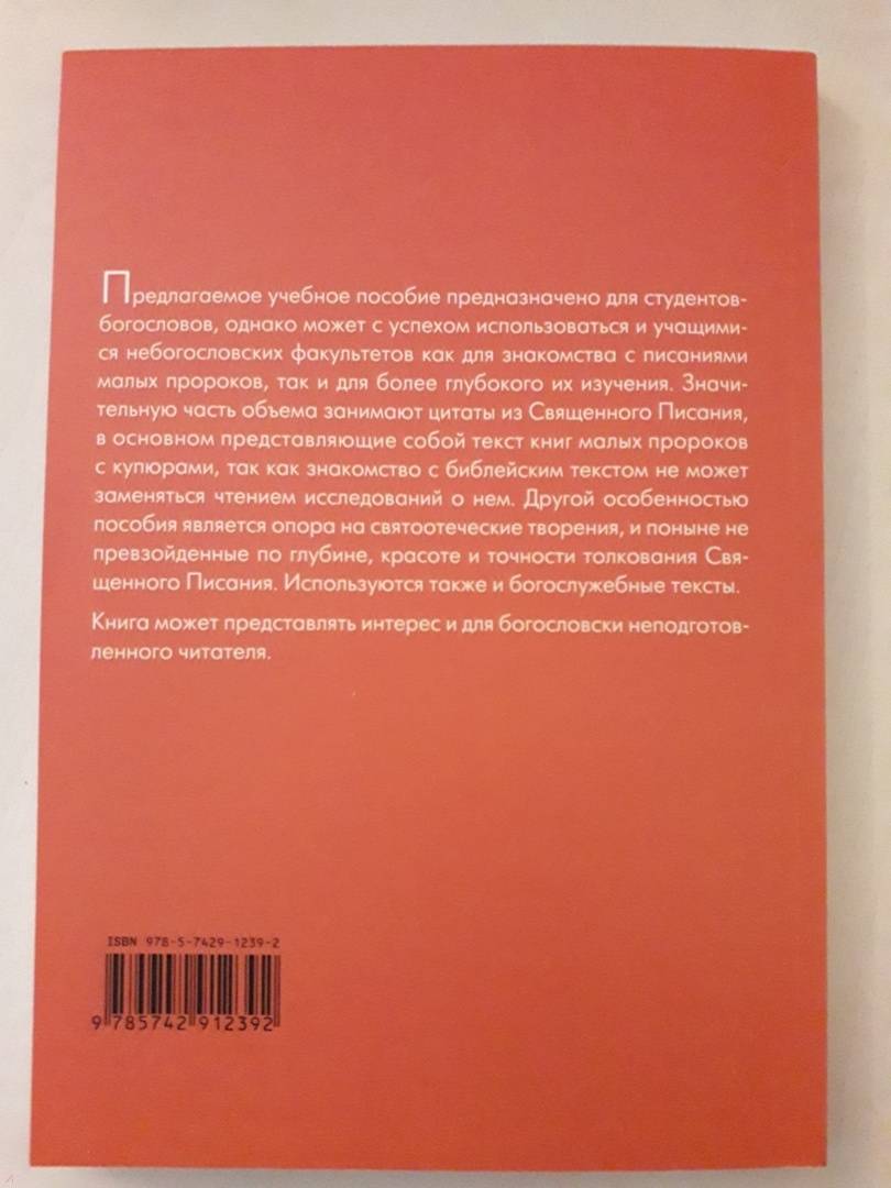 ОписаниеПредлагаемое учебное пособие предназначено для студентов-богословов, однако может с успехом использоваться и учащимися небогословских факультетов как для знакомства с писаниями малых пророков, так и для более глубокого их изучения. Значительную часть объема занимают цитаты из Священного Писания, в основном представляющие собой текст книг малых пророков с купюрами, так как знакомство с библей ским текстом не может заменяться чтением исследований о нем. Другой особенностью пособия является опора на святоотеческие творения, и поныне не превзойденные по глубине, красоте и точности толкования Священного Писания. Используются также и богослужебные тексты. Книга может представлять интерес и для богословски неподготовленного читателя.3-е издание, исправленное и дополненное.Предлагаемое учебное пособие предназначено для студентов-богословов, однако может с успехом использоваться и учащимися небогословских факультетов как для знакомства с писаниями малых пророков, так и для более глубокого их изучения. Значительную часть объема занимают цитаты из Священного Писания, в основном представляющие собой текст книг малых пророков с купюрами, так как знакомство с библей ским текстом не может заменяться чтением исследований о нем. Другой особенностью пособия является опора на святоотеческие творения, и поныне не превзойденные по глубине, красоте и точности толкования Священного Писания. Используются также и богослужебные тексты. Книга может представлять интерес и для богословски неподготовленного читателя.3-е издание, исправленное и дополненное.