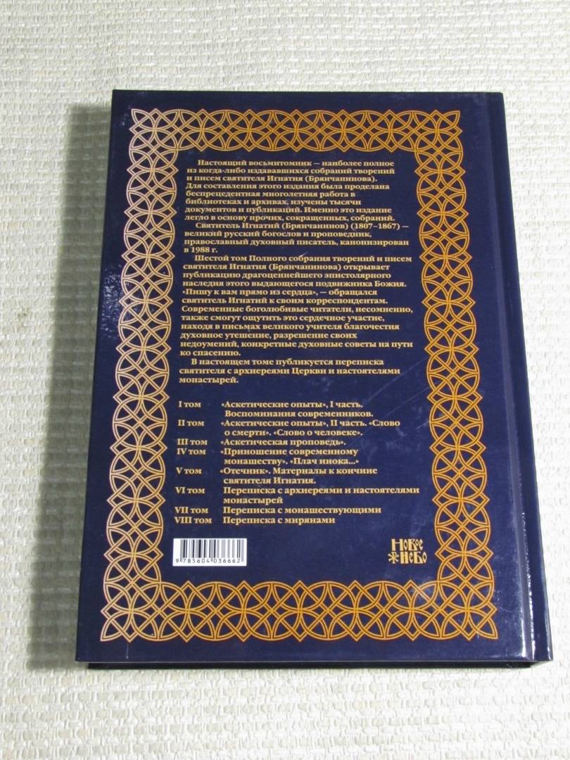 ОписаниеШестой том Полного собрания творений и писем святителя Игнатия (Брянчанинова) открывает публикацию драгоценнейшего эпистолярного наследия этого выдающегося подвижника Божия. «Пишу к вам прямо из сердца», — обращался святитель Игнатий к своим корреспондентам. Современные боголюбивые читатели, несомненно, также смогут ощутить это сердечное участие, находя в письмах великого учителя благочестия духовное утешение, разрешение своих недоумений, конкретные духовные советы на пути ко спасению.В настоящем томе публикуется переписка святителя с архиереями Церкви и настоятелями монастырей.3-е издание.Шестой том Полного собрания творений и писем святителя Игнатия (Брянчанинова) открывает публикацию драгоценнейшего эпистолярного наследия этого выдающегося подвижника Божия. «Пишу к вам прямо из сердца», — обращался святитель Игнатий к своим корреспондентам. Современные боголюбивые читатели, несомненно, также смогут ощутить это сердечное участие, находя в письмах великого учителя благочестия духовное утешение, разрешение своих недоумений, конкретные духовные советы на пути ко спасению.В настоящем томе публикуется переписка святителя с архиереями Церкви и настоятелями монастырей.3-е издание.