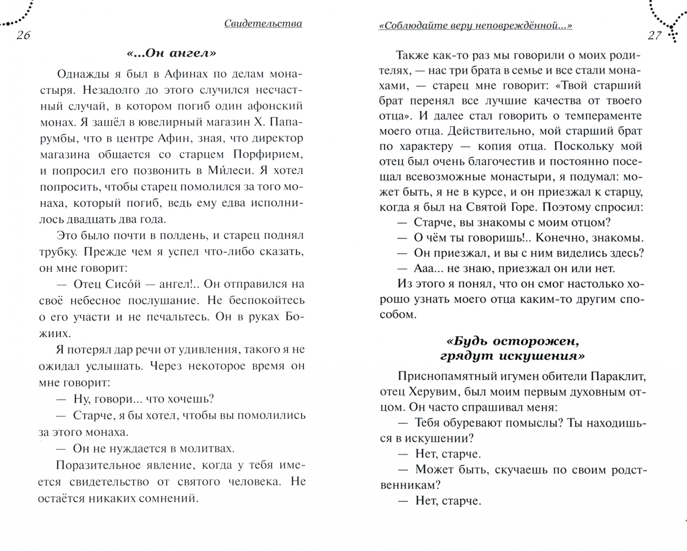 ОписаниеВ книге "Преподобный Порфирий пророк нашего времени" описываются реальные события из жизни греческих христиан нашего времени. Помощь Господа по молитвам преподобного Порфирия Кавсокаливита меняет их убеждения, укрепляет маловерных и обращает к вере. Видя, как старец спасал от бед и недугов всех обращавшихся к нему, читатель начинает глубже понимать значение слов "духовник" и "духовное чадо", убеждается, что Господь всегда рядом с нами, и именно Его любовь, по искренним молитвам, идущим из чистого сердца, помогает преодолевать трудности, которые кажутся непреодолимыми.В книге "Преподобный Порфирий пророк нашего времени" описываются реальные события из жизни греческих христиан нашего времени. Помощь Господа по молитвам преподобного Порфирия Кавсокаливита меняет их убеждения, укрепляет маловерных и обращает к вере. Видя, как старец спасал от бед и недугов всех обращавшихся к нему, читатель начинает глубже понимать значение слов "духовник" и "духовное чадо", убеждается, что Господь всегда рядом с нами, и именно Его любовь, по искренним молитвам, идущим из чистого сердца, помогает преодолевать трудности, которые кажутся непреодолимыми.