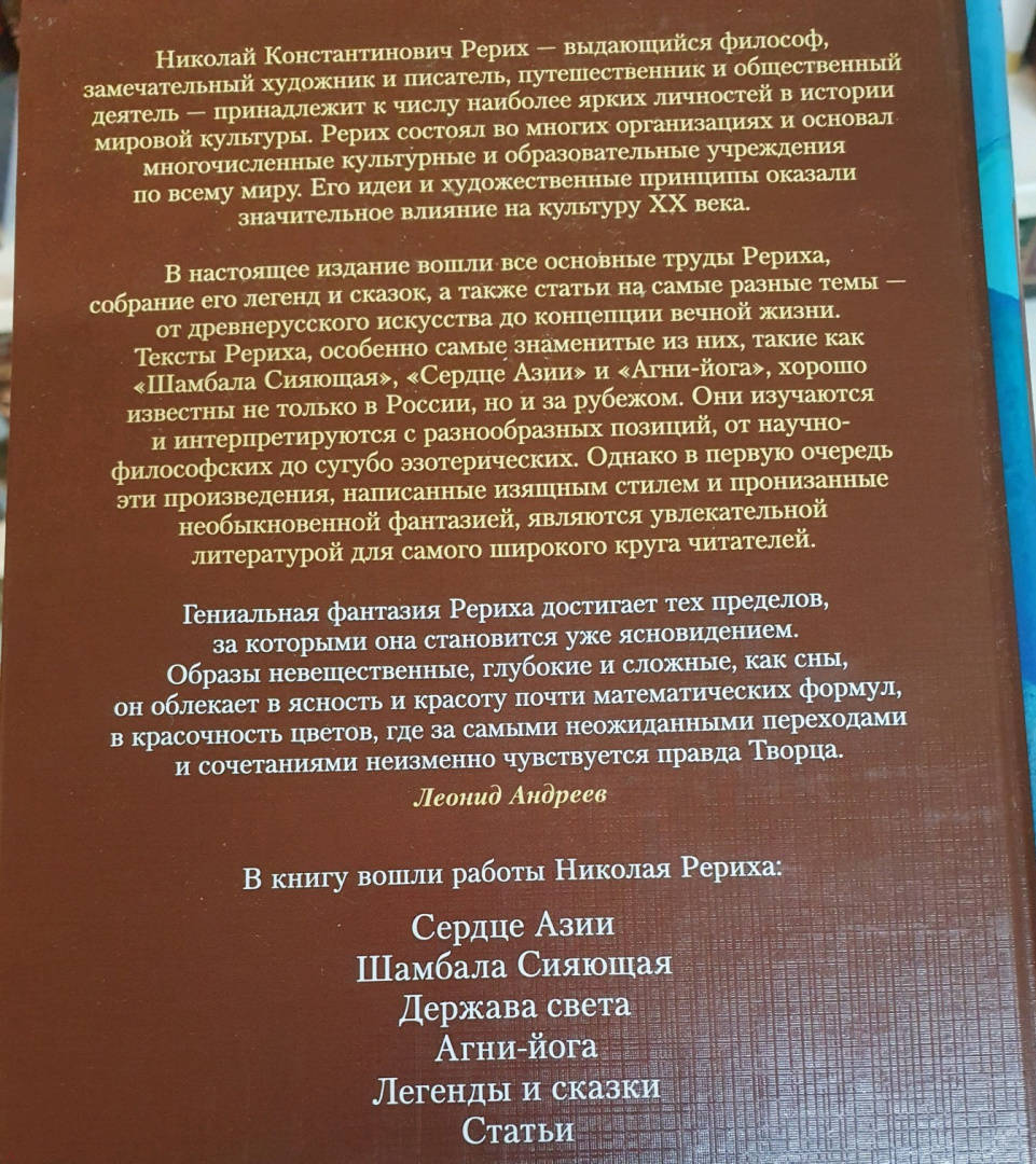 ОписаниеНиколай Константинович Рерих - выдающийся философ, замечательный художник и писатель, путешественник и общественный деятель - принадлежит к числу наиболее ярких личностей в истории мировой культуры. Рерих состоял во многих организациях и основал многочисленные культурные и образовательные учреждения по всему миру. Его идеи и художественные принципы оказали значительное влияние на культуру ХХ века. В настоящее издание вошли все основные труды Рериха, собрание его легенд и сказок, а также статьи на самые разные темы, от древнерусского искусства до концепции вечной жизни. Тексты Рериха, особенно самые знаменитые из них, такие как «Шамбала Сияющая», «Сердце Азии» и «Анги-йога», пользуются неувядающей популярностью не только в России, но и за рубежом. Они изучаются и интерпретируются с разнообразных позиций, от научно-философских до сугубо эзотерических. Однако в первую очередь эти произведения, написанные изящным стилем и пронизанные необыкновенной фантазией, являются увлекательной литературой для самого широкого круга читателей.СвернутьНиколай Константинович Рерих - выдающийся философ, замечательный художник и писатель, путешественник и общественный деятель - принадлежит к числу наиболее ярких личностей в истории мировой культуры. Рерих состоял во многих организациях и основал многочисленные культурные и образовательные учреждения по всему миру. Его идеи и художественные принципы оказали значительное влияние на культуру ХХ века. В настоящее издание вошли все основные труды Рериха, собрание его легенд и сказок, а также статьи на самые разные темы, от древнерусского искусства до концепции вечной жизни. Тексты Рериха, особенно самые знаменитые из них, такие как «Шамбала Сияющая», «Сердце Азии» и «Анги-йога», пользуются неувядающей популярностью не только в России, но и за рубежом. Они изучаются и интерпретируются с разнообразных позиций, от научно-философских до сугубо эзотерических. Однако в первую очередь эти произведения, написанные изящным стилем и пронизанные необыкновенной фантазией, являются увлекательной литературой для самого широкого круга читателей.СвернутьСвернуть