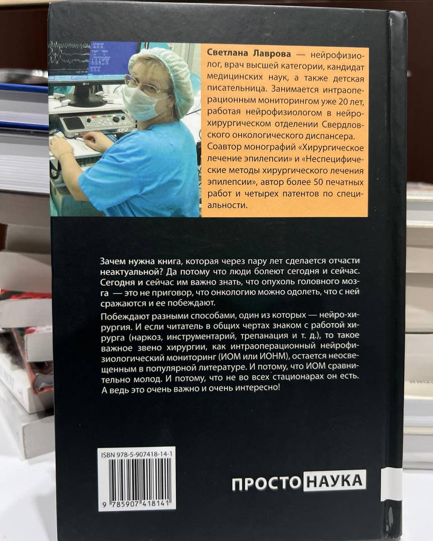 ОписаниеВ нейрохирургии все меняется очень быстро, но людям уже сегодня нужно знать, например, что опухоль головного мозга не приговор, что онкологию побеждают. И если в общих чертах читатель знаком с работой хирурга (наркоз, инструментарий, трепанация и т. д.), то такое важное звено хирургии, как интраоперационный нейрофизиологический мониторинг, остается неосвещенным в популярной литературе. Автор, которая занимается интраоперационным мониторингом уже 20 лет, рассказывает об этой захватывающе интересной работе, а также знакомит с некоторыми общими моментами нейрохирургии. Чем отличается наркоз при операциях на мозге от наркоза при других операциях? Нужна ли операция Жанне Д'Арк? Как делали трепанацию в каменном веке, и почему она была модна в Средние века? Какие инструменты используются в сегодняшней операционной? На эти и другие вопросы ответит эта книга.В нейрохирургии все меняется очень быстро, но людям уже сегодня нужно знать, например, что опухоль головного мозга не приговор, что онкологию побеждают. И если в общих чертах читатель знаком с работой хирурга (наркоз, инструментарий, трепанация и т. д.), то такое важное звено хирургии, как интраоперационный нейрофизиологический мониторинг, остается неосвещенным в популярной литературе. Автор, которая занимается интраоперационным мониторингом уже 20 лет, рассказывает об этой захватывающе интересной работе, а также знакомит с некоторыми общими моментами нейрохирургии. Чем отличается наркоз при операциях на мозге от наркоза при других операциях? Нужна ли операция Жанне Д'Арк? Как делали трепанацию в каменном веке, и почему она была модна в Средние века? Какие инструменты используются в сегодняшней операционной? На эти и другие вопросы ответит эта книга.