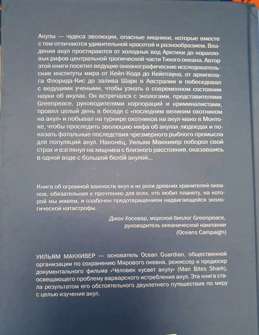 ОписаниеС точки зрения эволюции акулы старше деревьев; эти мощные животные пережили пять периодов массовых вымираний, превзойдя в живучести динозавров. Акулы - необходимое звено для поддержания баланса морских и океанических экосистем: они поедают останки мертвых китов, удаляют из популяций больных рыб, охраняют водоросли от черепах и поглощают мусор, выброшенный человеком в океан. Но что мы знаем о их жизни? Первая в своем роде книга основывается на данных последних научных исследований и результатах детального изучения четырех видов акул - большой белой акулы, акулы-мако, акулы-молота и тигровой акулы. Энтузиаст сохранения Мирового океана Уильям Маккивер путешествует по местам обитания акул - от коралловых рифов в центральной части Тихого океана, где каждую осень собираются группы больших белых акул, и тропических мангровых лесов, где живут стаями молодые лимонные акулы, до холодных вод Северной Атлантики, где обитают 400-летние гренландские полярные акулы, долгожители-рекордсмены среди позвоночных животных. Он прослеживает эволюцию мифа об акулах-людоедах и описывает фатальные последствия чрезмерного их уничтожения: от нападений акул погибает в среднем четыре человека в год, однако за то же время люди убивают 100 миллионов акул. Работа Маккивера - это погружение в тайны акул и настоятельный призыв защитить их. "Эта книга - итог моего двухлетнего путешествия, дань акулам как удивительным сверххищникам, сверхчувствительным мореплавателям, лучшим союзникам человека в мире природы. Благодаря новым технологиям, позволяющим ученым и морским биологам со всего света совершенно по-новому наблюдать за акулами, за последние годы нам удалось далеко шагнуть в понимании этих животных: их загадочного поведения, невероятных миграционных путей, выдающихся социальных навыков и даже тайн их сексуальной жизни. Вполне возможно, что именно акулы станут ключом к пониманию загадок океанов". (Уильям Маккивер)СвернутьС точки зрения эволюции акулы старше деревьев; эти мощные животные пережили пять периодов массовых вымираний, превзойдя в живучести динозавров. Акулы - необходимое звено для поддержания баланса морских и океанических экосистем: они поедают останки мертвых китов, удаляют из популяций больных рыб, охраняют водоросли от черепах и поглощают мусор, выброшенный человеком в океан. Но что мы знаем о их жизни? Первая в своем роде книга основывается на данных последних научных исследований и результатах детального изучения четырех видов акул - большой белой акулы, акулы-мако, акулы-молота и тигровой акулы. Энтузиаст сохранения Мирового океана Уильям Маккивер путешествует по местам обитания акул - от коралловых рифов в центральной части Тихого океана, где каждую осень собираются группы больших белых акул, и тропических мангровых лесов, где живут стаями молодые лимонные акулы, до холодных вод Северной Атлантики, где обитают 400-летние гренландские полярные акулы, долгожители-рекордсмены среди позвоночных животных. Он прослеживает эволюцию мифа об акулах-людоедах и описывает фатальные последствия чрезмерного их уничтожения: от нападений акул погибает в среднем четыре человека в год, однако за то же время люди убивают 100 миллионов акул. Работа Маккивера - это погружение в тайны акул и настоятельный призыв защитить их. "Эта книга - ит