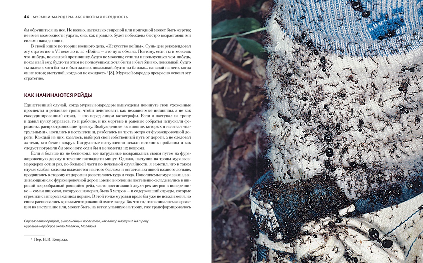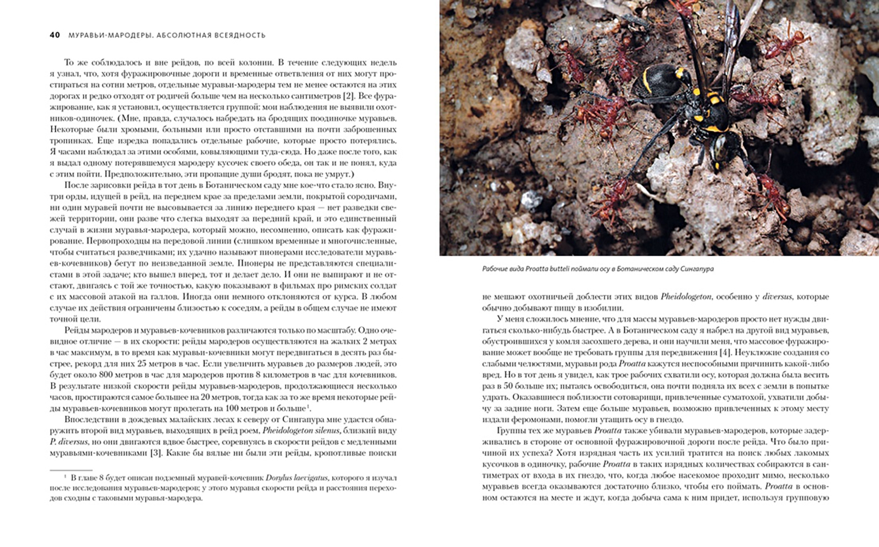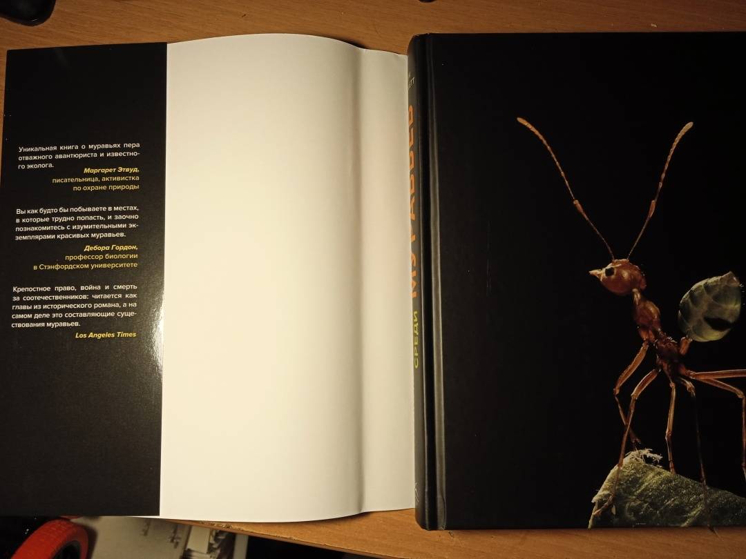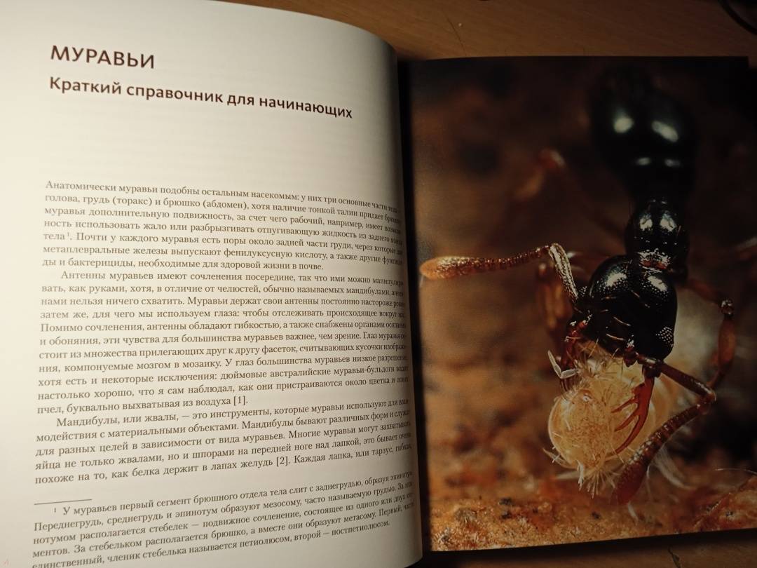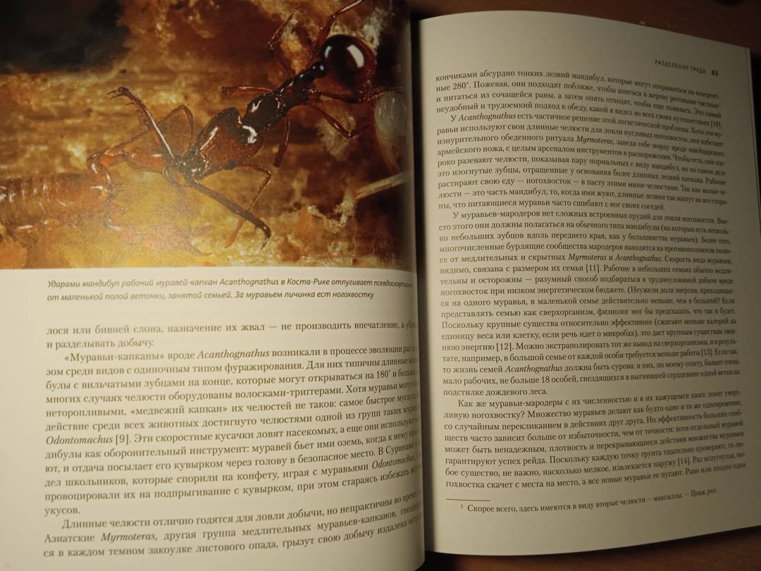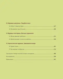 «Муравьи и люди обладают сходными чертами общественной организации, потому что и их, и наше сообщества предназначены для решения сходных задач. Также есть смысл в уподоблении муравьиной семьи целому организму. Как семьи муравьев — иногда называемые из-за этого сходства “сверхорганизмами” — регулируют свою сложную организацию, чтобы функционировать как единое целое? Кому в семье добывать еду, убирать отходы, растить новое поколение? И чему применительно к этим задачам могут нас научить муравьи? Чтобы выяснить это, начнем наши приключения среди муравьев». (Марк Моффетт)СвернутьСвернуть -