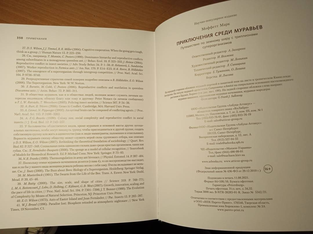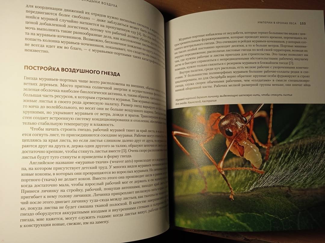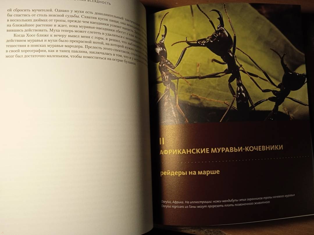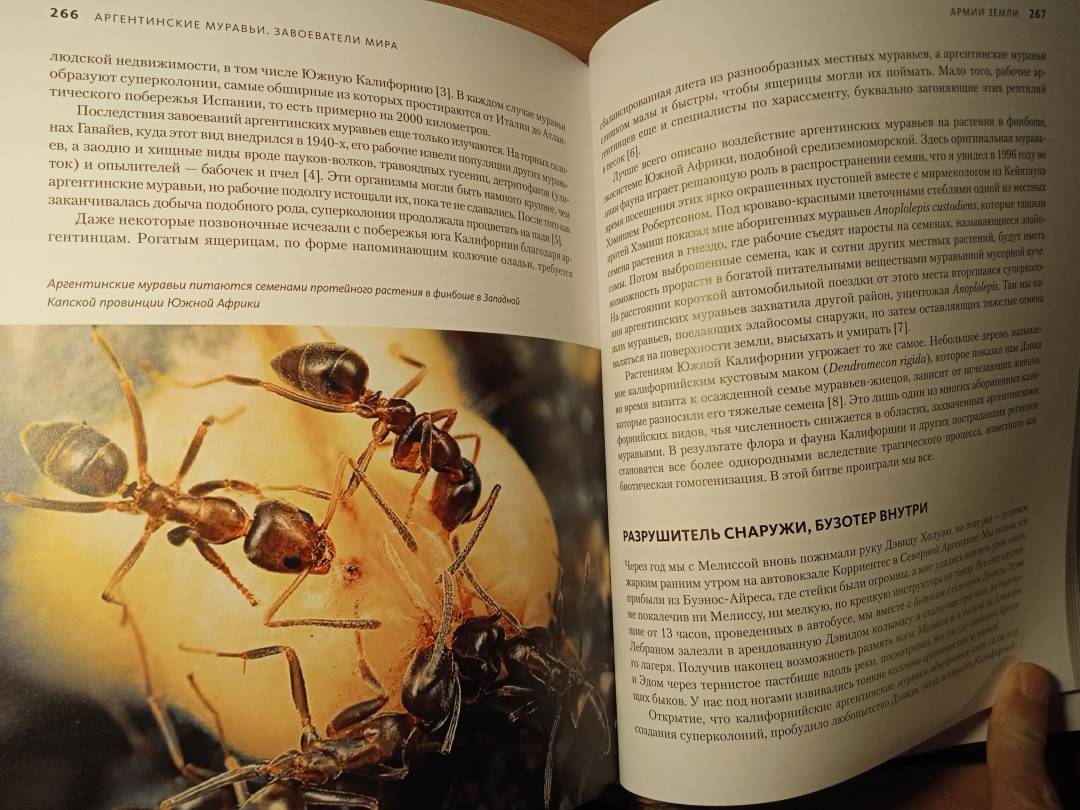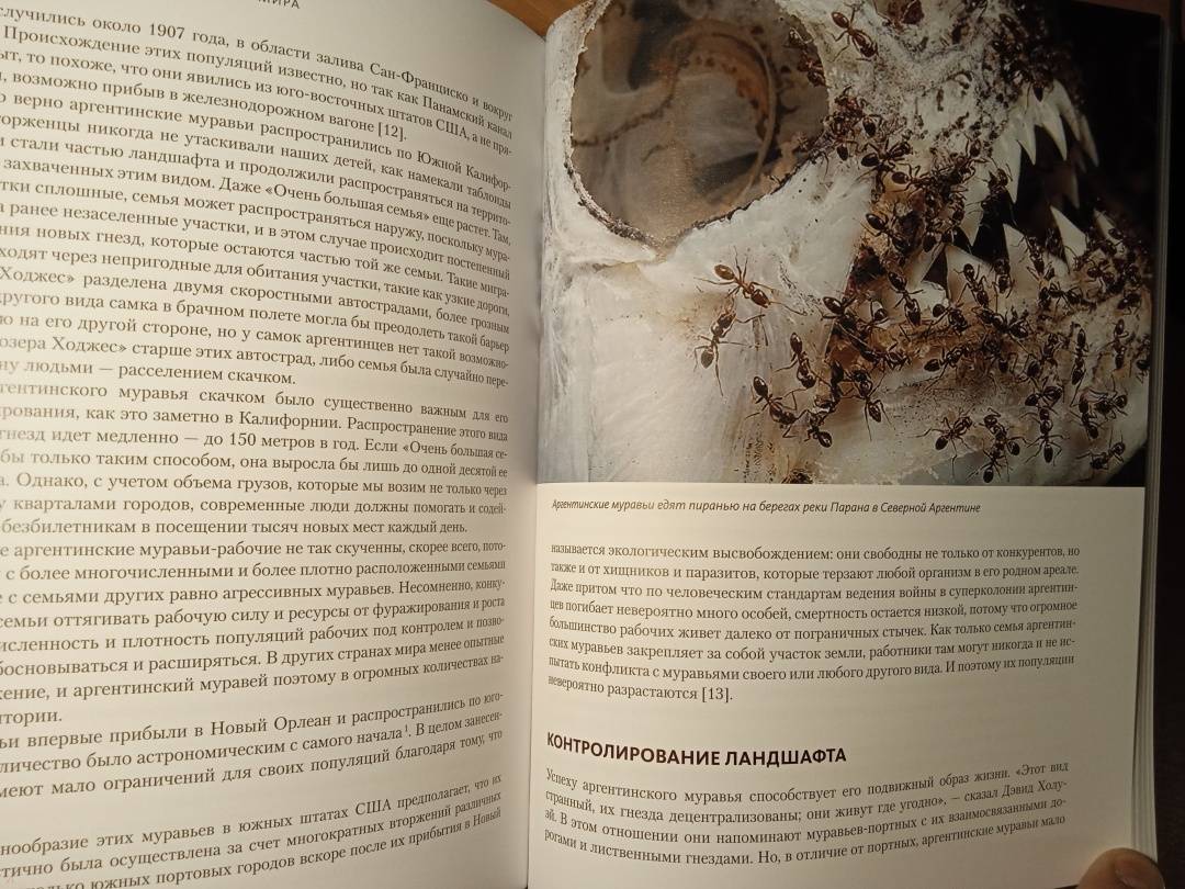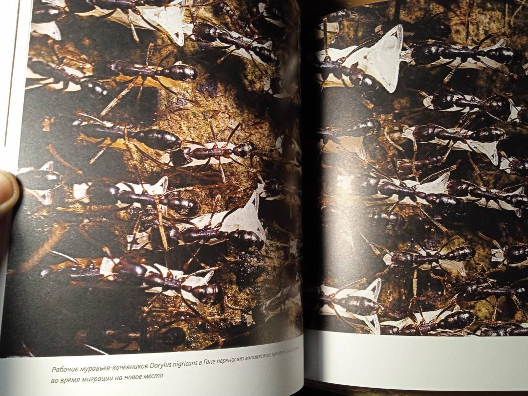 «Муравьи и люди обладают сходными чертами общественной организации, потому что и их, и наше сообщества предназначены для решения сходных задач. Также есть смысл в уподоблении муравьиной семьи целому организму. Как семьи муравьев — иногда называемые из-за этого сходства “сверхорганизмами” — регулируют свою сложную организацию, чтобы функционировать как единое целое? Кому в семье добывать еду, убирать отходы, растить новое поколение? И чему применительно к этим задачам могут нас научить муравьи? Чтобы выяснить это, начнем наши приключения среди муравьев». (Марк Моффетт)СвернутьМуравьи — самые вездесущие создания на Земле: они обитают на всех континентах, кроме Антарктиды, и живут практически в любом климате. Они превосходят людей числом в миллионы раз, а их суммарный вес примерно такой же, как вес всех людей. В своей великолепно иллюстрированной книге, вобравшей в себя все самое интересное из энтомологических путешествий по всему земному шару, включая Нигерию, Индонезию, Австралию, Калифорнию, берега Амазонки и другие экзотические уголки, выдающийся американский эколог и биолог Марк Моффетт представляет четыре способа наблюдений за муравьями: можно наблюдать за одной особью как за индивидом, воспринимать семью муравьев как общество, как сверхорганизм и как нечто подобное коллективному разуму и сознанию. От стадий развития муравья и его анатомии до сложнейших социальных навыков и взаимодействий — вы познакомитесь ближе с удивительным миром муравьев на примере жизнедеятельности шести видов: муравьев-мародеров из тропической Азии, муравьев-кочевников из Африки, муравьев-портных из тропической Азии, Африки и Австралии, муравьев-амазонок, муравьев-листорезов и, наконец, аргентинских муравьев, которые завоевывают весь мир на наших глазах.