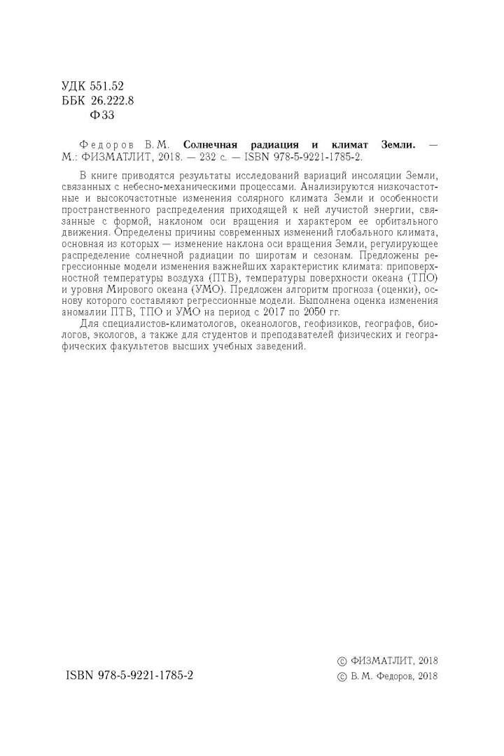 ОписаниеВ книге приводятся результаты исследований вариаций инсоляции Земли, связанных с небесно-механическими процессами. Анализируются низкочастотные и высокочастотные изменения солярного климата Земли и особенности пространственного распределения приходящей к ней лучистой энергии, связанные с формой, наклоном оси вращения и характером ее орбитального движения. Определены причины современных изменений глобального климата, основная из которых - изменение наклона оси вращения Земли, регулирующее распределение солнечной радиации по широтам и сезонам. Предложены регрессионные модели изменения важнейших характеристик климата: приповерхностной температуры воздуха (ПТВ), температуры поверхности океана (ТПО) и уровня Мирового океана (УМО). Предложен алгоритм прогноза (оценки), основу которого составляют регрессионные модели. Выполнена оценка изменения аномалии ПТВ, ТПО и УМО на период с 2017 по 2050 гг.Для специалистов-климатологов, океанологов, геофизиков, географов, биологов, экологов, а также для студентов и преподавателей физических и географических факультетов высших учебных заведений.СвернутьВ книге приводятся результаты исследований вариаций инсоляции Земли, связанных с небесно-механическими процессами. Анализируются низкочастотные и высокочастотные изменения солярного климата Земли и особенности пространственного распределения приходящей к ней лучистой энергии, связанные с формой, наклоном оси вращения и характером ее орбитального движения. Определены причины современных изменений глобального климата, основная из которых - изменение наклона оси вращения Земли, регулирующее распределение солнечной радиации по широтам и сезонам. Предложены регрессионные модели изменения важнейших характеристик климата: приповерхностной температуры воздуха (ПТВ), температуры поверхности океана (ТПО) и уровня Мирового океана (УМО). Предложен алгоритм прогноза (оценки), основу которого составляют регрессионные модели. Выполнена оценка изменения аномалии ПТВ, ТПО и УМО на период с 2017 по 2050 гг.Для специалистов-климатологов, океанологов, геофизиков, географов, биологов, экологов, а также для студентов и преподавателей физических и географических факультетов высших учебных заведений.СвернутьСвернуть