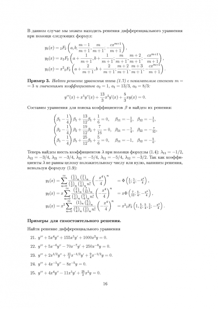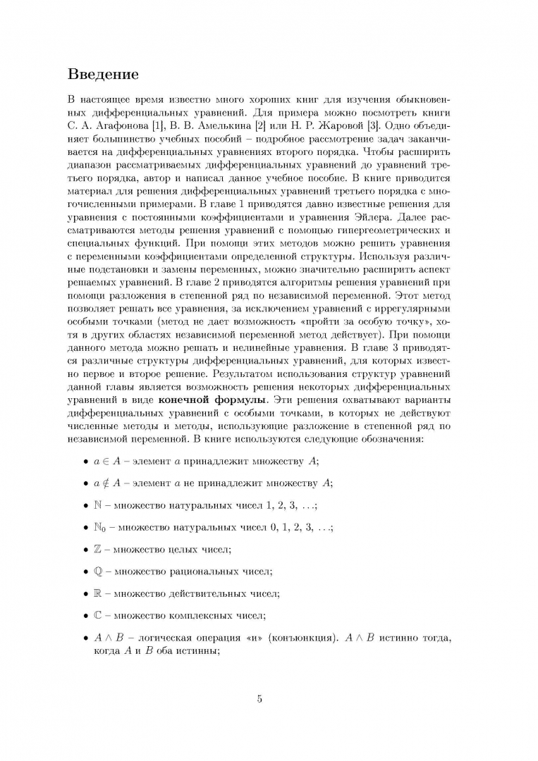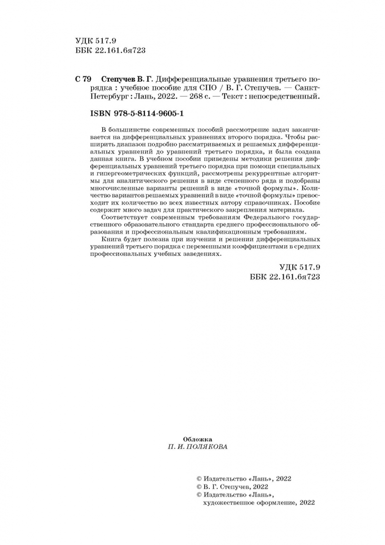 ОписаниеВ большинстве современных пособий рассмотрение задач заканчивается на дифференциальных уравнениях второго порядка. Чтобы расширить диапазон подробно рассматриваемых и решаемых дифференциальных уравнений до уравнений третьего порядка, была и создана данная книга. В данной книге приведены методики решения дифференциальных уравнений третьего порядка при помощи специальных и гипергеометрических функций, рассмотрены рекуррентные алгоритмы для аналитического решения в виде степенного ряда и подобраны многочисленные варианты решений в виде «точной формулы». Количество вариантов решаемых уравнений в виде «точной формулы» превосходит все известные автору справочники. Пособие содержит большое количество задач для практического закрепления материала. Книга будет полезна при изучении и решении дифференциальных уравнений третьего порядка с переменными коэффициентами в средних профессиональных учебных заведениях.В большинстве современных пособий рассмотрение задач заканчивается на дифференциальных уравнениях второго порядка. Чтобы расширить диапазон подробно рассматриваемых и решаемых дифференциальных уравнений до уравнений третьего порядка, была и создана данная книга. В данной книге приведены методики решения дифференциальных уравнений третьего порядка при помощи специальных и гипергеометрических функций, рассмотрены рекуррентные алгоритмы для аналитического решения в виде степенного ряда и подобраны многочисленные варианты решений в виде «точной формулы». Количество вариантов решаемых уравнений в виде «точной формулы» превосходит все известные автору справочники. Пособие содержит большое количество задач для практического закрепления материала. Книга будет полезна при изучении и решении дифференциальных уравнений третьего порядка с переменными коэффициентами в средних профессиональных учебных заведениях.