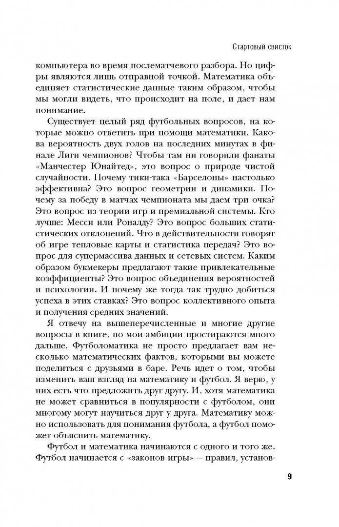 ОписаниеФутболоматика. Как благодаря математике "Барселона" выигрывает, Роналду забивает, а букмекеры зарабатывают состоянияДоступным языком автор рассказывает, как математика определяет результаты в футболе. Как "тики-така" стала одной из самых эффективных тактик в истории? Каким образом букмекеры рассчитывают коэффициенты? А как можно их перехитрить?"Футболоматика" объясняет, как лучшие клубы мира конвертируют статистические данные в выигранные матчи. Вы убедитесь, что точные науки - один из краеугольных камней современного футбола.Футболоматика. Как благодаря математике "Барселона" выигрывает, Роналду забивает, а букмекеры зарабатывают состоянияДоступным языком автор рассказывает, как математика определяет результаты в футболе. Как "тики-така" стала одной из самых эффективных тактик в истории? Каким образом букмекеры рассчитывают коэффициенты? А как можно их перехитрить?"Футболоматика" объясняет, как лучшие клубы мира конвертируют статистические данные в выигранные матчи. Вы убедитесь, что точные науки - один из краеугольных камней современного футбола.