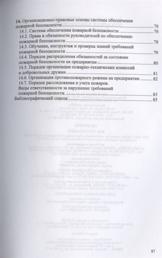 ОписаниеВ учебном пособии изложены общетеоретические, организационно-правовые основы пожарной безопасности, методы и средства обнаружения и тушения пожаров, меры защиты от пожаров на территории предприятий, зданий, сооружений, и обеспечения пожаро- и взрывобезопасности технологических процессов.Пособие предназначено для студентов высших учебных заведений, обучающихся по программам бакалавриата направления подготовки "Техносферная безопасность". Рекомендуется для специалистов, работающих в области безопасности жизнедеятельности.4-е издание, стереотипное.В учебном пособии изложены общетеоретические, организационно-правовые основы пожарной безопасности, методы и средства обнаружения и тушения пожаров, меры защиты от пожаров на территории предприятий, зданий, сооружений, и обеспечения пожаро- и взрывобезопасности технологических процессов.Пособие предназначено для студентов высших учебных заведений, обучающихся по программам бакалавриата направления подготовки "Техносферная безопасность". Рекомендуется для специалистов, работающих в области безопасности жизнедеятельности.4-е издание, стереотипное.