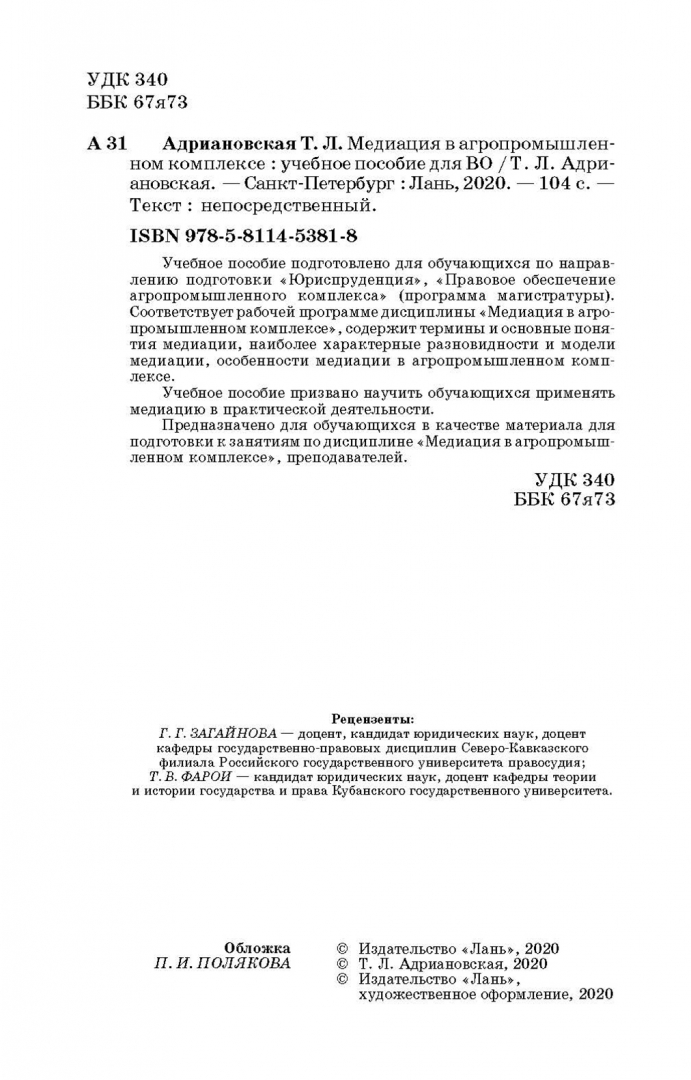 Татьяна Адриановская: Медиация в агропромышленном комплексе. Учебное пособие