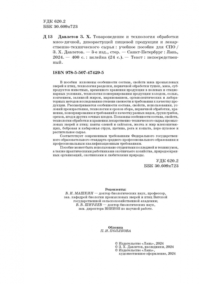 Закария Давлетов: Товароведение и технология обработки мясо-дичной, дикорастущей пищевой продукции. Уч.пособие для СПО