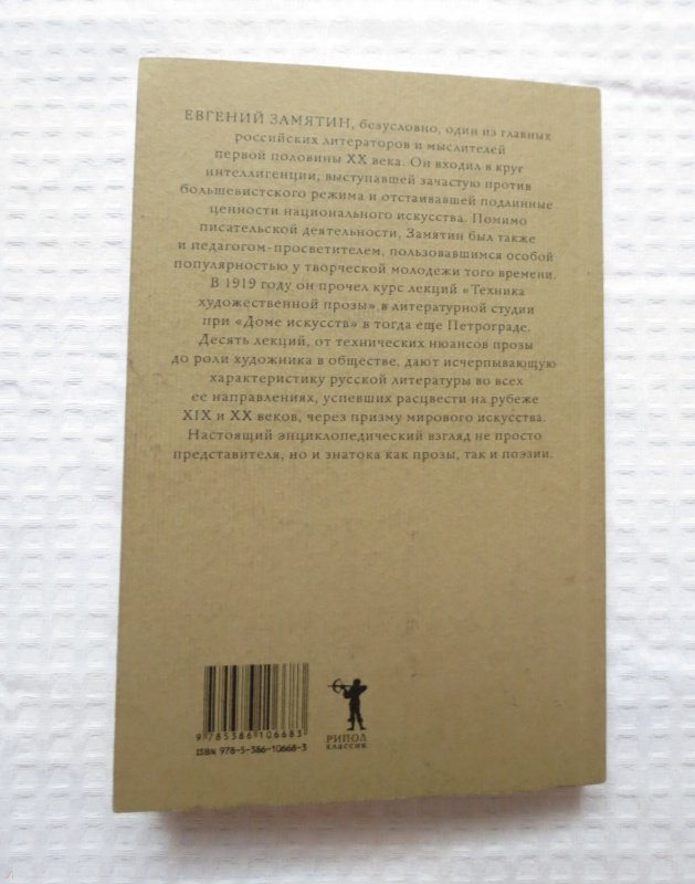 ОписаниеЕвгений Замятин, безусловно, один из главных российских литераторов и мыслителей первой половины XX века. Он входил в круг интеллигенции, выступавшей зачастую против большевистского режима и отстаивавшей подлинные ценности национального искусства. Помимо писательской деятельности, Замятин был также и педагогом-просветителем, пользовавшимся особой популярностью у творческой молодежи того времени. В 1919 году он прочел курс лекции "Техника художественной прозы" в литературной студии при Доме искусств в тогда еще Петрограде.Десять лекций, от технических нюансов прозы до роли художника в обществе, дают исчерпывающую характеристику русской литературы во всех ее направлениях, успевших расцвести на рубеже XIX и XX веков, через призму мирового искусства. Настоящий энциклопедический взгляд не просто представителя, но и знатока как прозы, так и поэзии.Евгений Замятин, безусловно, один из главных российских литераторов и мыслителей первой половины XX века. Он входил в круг интеллигенции, выступавшей зачастую против большевистского режима и отстаивавшей подлинные ценности национального искусства. Помимо писательской деятельности, Замятин был также и педагогом-просветителем, пользовавшимся особой популярностью у творческой молодежи того времени. В 1919 году он прочел курс лекции "Техника художественной прозы" в литературной студии при Доме искусств в тогда еще Петрограде.Десять лекций, от технических нюансов прозы до роли художника в обществе, дают исчерпывающую характеристику русской литературы во всех ее направлениях, успевших расцвести на рубеже XIX и XX веков, через призму мирового искусства. Настоящий энциклопедический взгляд не просто представителя, но и знатока как прозы, так и поэзии.