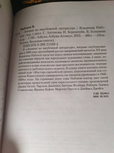 Объем, стр. 480 ISBN 978-5-389-21349-4 Автор Набоков Владимир Владимирович, Антонов С. А., Голышев Виктор Петрович, Бернштейн Инна Максимовна Переводчик Антонов С. А., Голышев Виктор Петрович, Бернштейн Инна Максимовна Серия Non-Fiction. Большие книги Язык Русский Минимальный возраст 16+ Год издания книги 2022 Тип обложки Твердый переплет Иллюстрации Без иллюстраций Вес, г 564г Размеры 217х147х24 мм - Отзывы