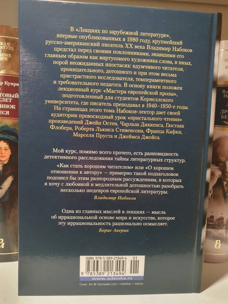 ОписаниеВ «Лекциях по зарубежной литературе», впервые опубликованных в 1980 году, крупнейший русско-американский писатель ХХ века Владимир Набоков предстал перед своими поклонниками, знавшими его главным образом как виртуозного художника слова, в иных, порой неожиданных ипостасях: вдумчивого читателя, проницательного, дотошного и при этом весьма пристрастного исследователя, темпераментного и требовательного педагога. В основу книги положен лекционный курс «Мастера европейской прозы», подготовленный для студентов Корнеллского университета, где писатель преподавал в 1940–1950-е годы. На страницах этого тома Набоков-лектор дает своей аудитории превосходный урок «пристального чтения» произведений Джейн Остен, Чарльза Диккенса, Гюстава Флобера, Роберта Льюиса Стивенсона, Франца Кафки, Марселя Пруста и Джеймса Джойса.В «Лекциях по зарубежной литературе», впервые опубликованных в 1980 году, крупнейший русско-американский писатель ХХ века Владимир Набоков предстал перед своими поклонниками, знавшими его главным образом как виртуозного художника слова, в иных, порой неожиданных ипостасях: вдумчивого читателя, проницательного, дотошного и при этом весьма пристрастного исследователя, темпераментного и требовательного педагога. В основу книги положен лекционный курс «Мастера европейской прозы», подготовленный для студентов Корнеллского университета, где писатель преподавал в 1940–1950-е годы. На страницах этого тома Набоков-лектор дает своей аудитории превосходный урок «пристального чтения» произведений Джейн Остен, Чарльза Диккенса, Гюстава Флобера, Роберта Льюиса Стивенсона, Франца Кафки, Марселя Пруста и Джеймса Джойса.