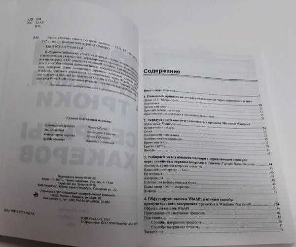 ОписаниеВ сборнике избранных статей из журнала "Хакер" описана технология поиска и эксплуатации уязвимостей, детектирования "песочниц" и антиотладки, управления процессами в ОС семейства Microsoft Windows и их маскировки. Рассказывается о способах обмена данными между вредоносными программами и управляющим сервером. Даны конкретные примеры написания драйвера режима ядра Windows, перехвата управления приложениями через WinAPI, создания стилера для получения паролей из браузеров Chrome и Firefox. Описаны приемы обфускации кода PowerShell. Отдельные разделы посвящены взлому iPhone и Apple Watch.В сборнике избранных статей из журнала "Хакер" описана технология поиска и эксплуатации уязвимостей, детектирования "песочниц" и антиотладки, управления процессами в ОС семейства Microsoft Windows и их маскировки. Рассказывается о способах обмена данными между вредоносными программами и управляющим сервером. Даны конкретные примеры написания драйвера режима ядра Windows, перехвата управления приложениями через WinAPI, создания стилера для получения паролей из браузеров Chrome и Firefox. Описаны приемы обфускации кода PowerShell. Отдельные разделы посвящены взлому iPhone и Apple Watch.