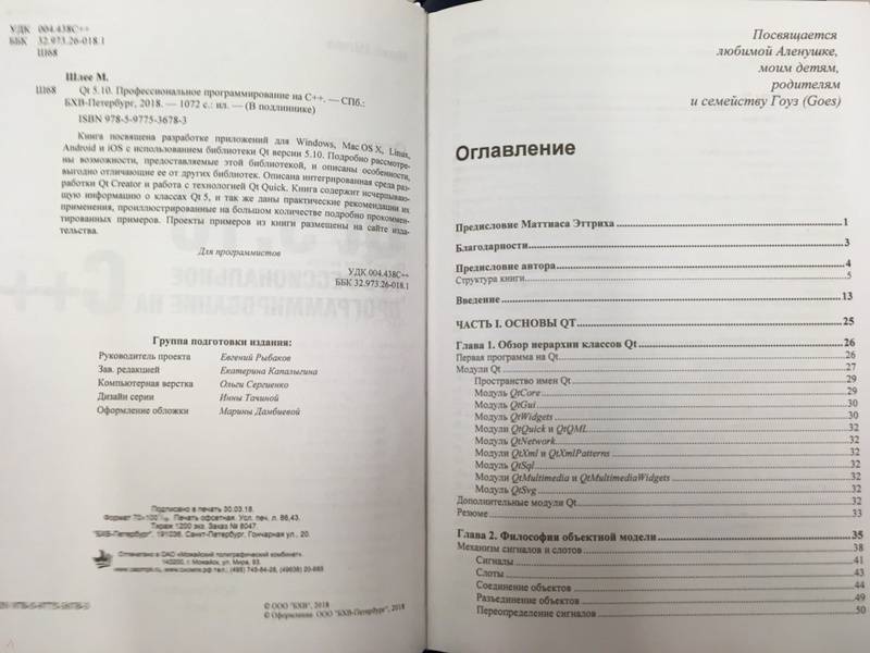 ОписаниеКнига посвящена разработке приложений для Windows, Mac OS X, Linux, Android и iOS с использованием библиотеки Qt версии 5.10. Подробно рассмотрены возможности, предоставляемые этой библиотекой, и описаны особенности, выгодно отличающие ее от других библиотек. Описана интегрированная среда разработки Qt Creator и работа с технологией Qt Quick. Книга содержит исчерпывающую информацию о классах Qt 5, и так же даны практические рекомендации их применения, проиллюстрированные на большом количестве подробно прокомментированных примеров. Проекты примеров из книги размещены на сайте издательства.Книга посвящена разработке приложений для Windows, Mac OS X, Linux, Android и iOS с использованием библиотеки Qt версии 5.10. Подробно рассмотрены возможности, предоставляемые этой библиотекой, и описаны особенности, выгодно отличающие ее от других библиотек. Описана интегрированная среда разработки Qt Creator и работа с технологией Qt Quick. Книга содержит исчерпывающую информацию о классах Qt 5, и так же даны практические рекомендации их применения, проиллюстрированные на большом количестве подробно прокомментированных примеров. Проекты примеров из книги размещены на сайте издательства.
