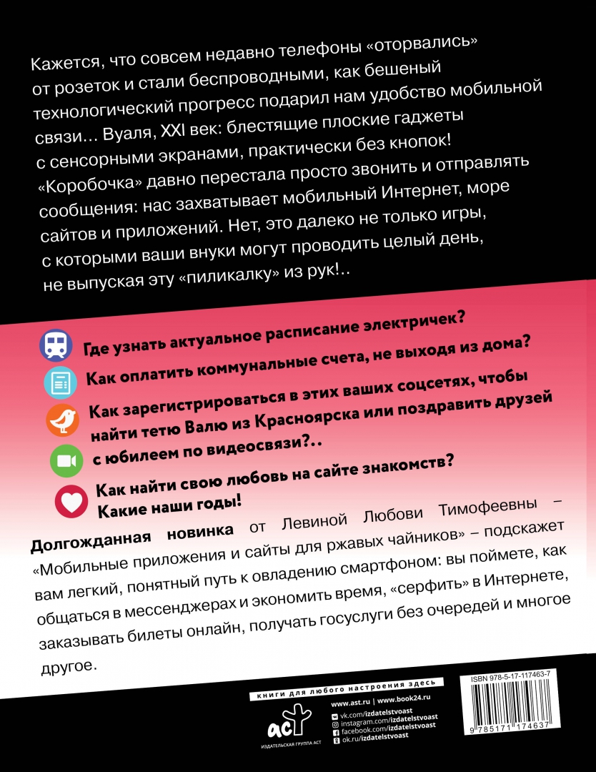 СвернутьКажется, что совсем недавно телефоны «оторвались» от розеток и стали беспроводными, как бешеный технологический прогресс подарил нам удобство мобильной связи… Вуаля, XXI век: блестящие плоские гаджеты с сенсорными экранами, практически без кнопок! «Коробочка» давно перестала просто звонить и слать сообщения: нас захватывает мобильный Интернет, море сайтов и приложений. Нет, это далеко не только игры, с которыми ваши внуки могут проводить целый день, не выпуская эту «пиликалку» из рук!..Где узнать актуальное расписание электричек? Как оплатить коммунальные счета, не выходя из дома? Как зарегистрироваться в этих наших соцсетях, чтобы найти тетю Валю из Красноярска или поздравить друзей с юбилеем по видеосвязи?.. Как найти свою любовь на сайте знакомст? Какие наши годы!Долгожданная новинка от Левиной Любови Тимофеевны – «Мобильные приложения и сайты для ржавых чайников» – подскажет вам легкий, понятный путь к овладению смартфоном: вы поймете, как общаться в мессенджерах и экономить время, «серфить» в Интернете, заказывать билеты онлайн, получать госуслуги без очередей и многое другое.Новинка от Левиной Любови Тимофеевны - книга про полезные сайты и мобильные приложения! В ней вы найдете советы и инструкции по установке и использованию нужных приложений.