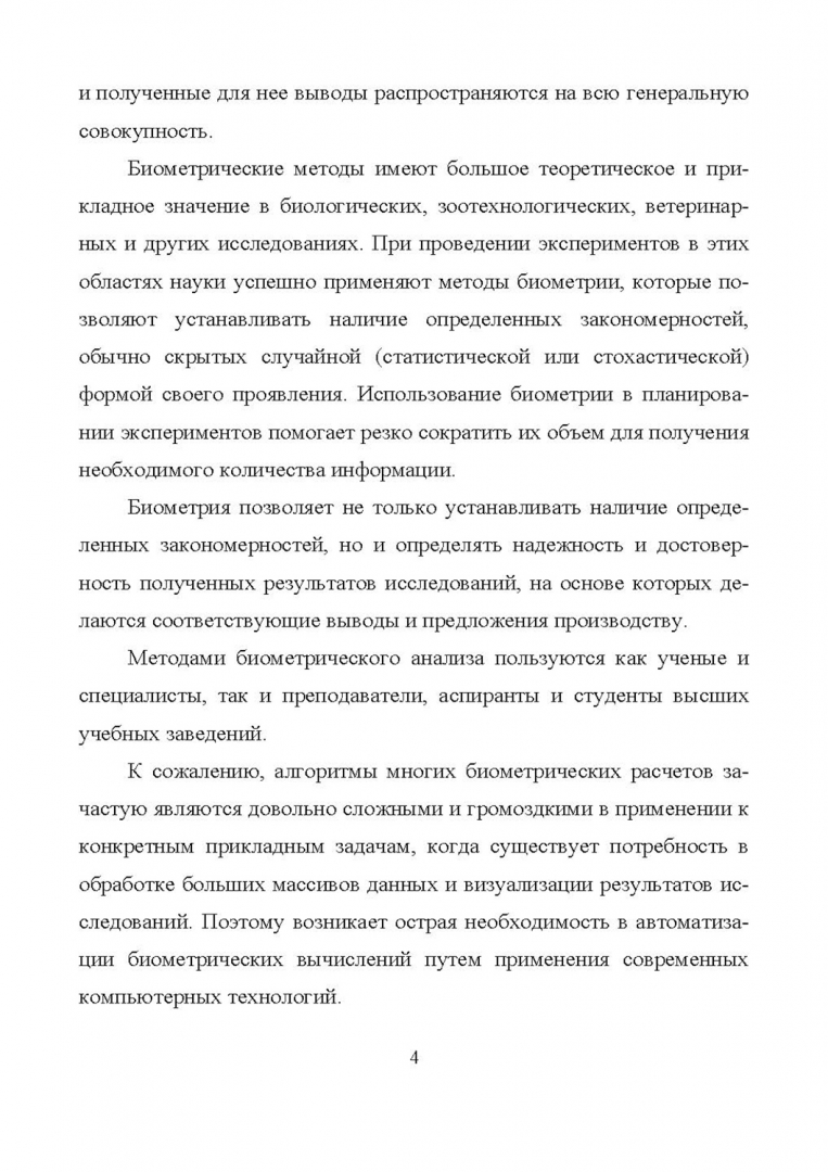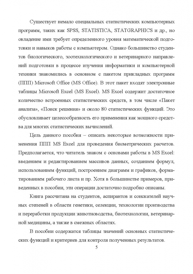 ОписаниеВ учебном пособии в доступной форме подробно изложены основы применения пакета прикладных программ MS Excel для проведения большого количества биометрических расчетов. В первой части кратко повторяются основные понятия, положения и определения биометрии и вариационной статистики. Во второй части приведены алгоритмы биометрических вычислений и указаны пути их реализации с применением ППП MS Excel.Пособие предназначено для бакалавров и магистров, обучающихся по направлениям "Зоотехния", "Технология производства и переработки сельскохозяйственной продукции", студентов специальности "Ветеринария", а также будет полезно аспирантам и соискателям научных степеней в области генетики, селекции, технологии производства и переработки продукции животноводства, биотехнологии, ветеринарной медицины, а также в смежных областях.3-е издание, стереотипное.В учебном пособии в доступной форме подробно изложены основы применения пакета прикладных программ MS Excel для проведения большого количества биометрических расчетов. В первой части кратко повторяются основные понятия, положения и определения биометрии и вариационной статистики. Во второй части приведены алгоритмы биометрических вычислений и указаны пути их реализации с применением ППП MS Excel.Пособие предназначено для бакалавров и магистров, обучающихся по направлениям "Зоотехния", "Технология производства и переработки сельскохозяйственной продукции", студентов специальности "Ветеринария", а также будет полезно аспирантам и соискателям научных степеней в области генетики, селекции, технологии производства и переработки продукции животноводства, биотехнологии, ветеринарной медицины, а также в смежных областях.3-е издание, стереотипное.