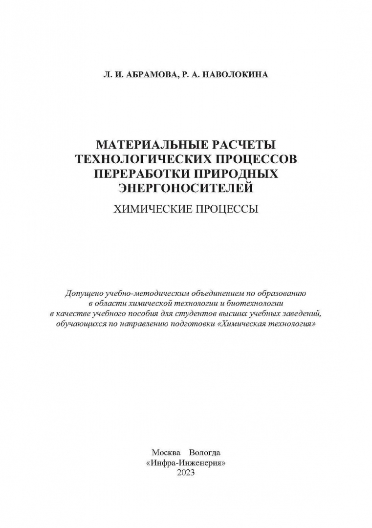 Абрамова, Наволокина: Материальные расчеты технологических процессов переработки природных энергоносителей. Химические пр.