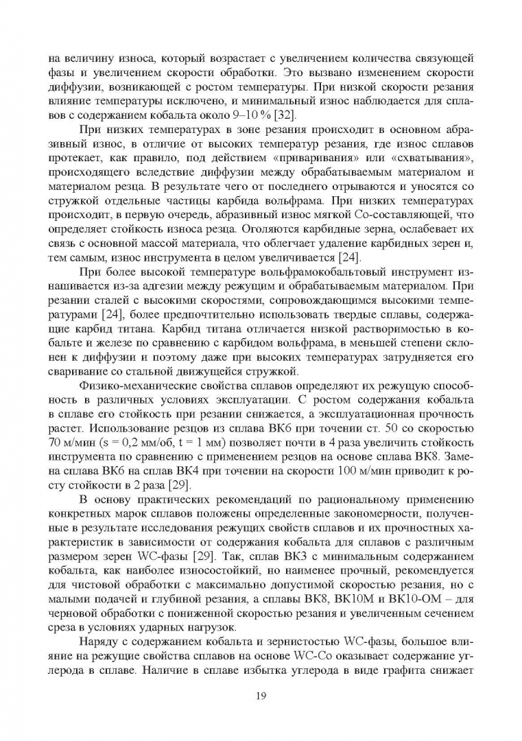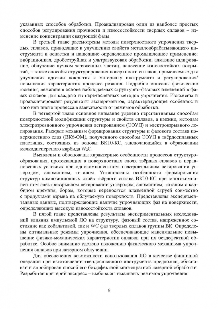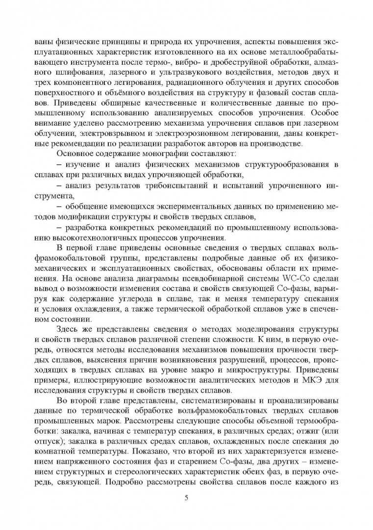 ОписаниеСистематизированы и проанализированы данные по традиционным и перспективным методам упрочняющей обработки широко используемых твердых сплавов вольфрамокобальтовой группы. Изложены физические основы структурообразования в сплавах после термо-, вибро- и дробеструйной обработки, алмазного шлифования, лазерного и ультразвукового воздействия, электроэрозионного упрочнения легированием, электровзрывного легирования, радиационного облучения и других способов поверхностного и объемного воздействия на их структуру и фазовый состав. Проанализирована природа упрочнения спеченных твердых сплавов и аспекты повышения эксплуатационных характеристик изготовленного на их основе металлообрабатывающего инструмента. Обоснованы режимы его упрочнения и эксплуатации. Представлены методы моделирования структуры и свойств твердых сплавов различной степени сложности, применяемые для решения различного круга задач. Приведены результаты практического использования анализируемых способов упрочнения. Для инженерных и научных работников, занимающихся исследованием и применением высокотехнологичных методов упрочняющей обработки.СвернутьСистематизированы и проанализированы данные по традиционным и перспективным методам упрочняющей обработки широко используемых твердых сплавов вольфрамокобальтовой группы. Изложены физические основы структурообразования в сплавах после термо-, вибро- и дробеструйной обработки, алмазного шлифования, лазерного и ультразвукового воздействия, электроэрозионного упрочнения легированием, электровзрывного легирования, радиационного облучения и других способов поверхностного и объемного воздействия на их структуру и фазовый состав. Проанализирована природа упрочнения спеченных твердых сплавов и аспекты повышения эксплуатационных характеристик изготовленного на их основе металлообрабатывающего инструмента. Обоснованы режимы его упрочнения и эксплуатации. Представлены методы моделирования структуры и свойств твердых сплавов различной степени сложности, применяемые для решения различного круга задач. Приведены результаты практического использования анализируемых способов упрочнения. Для инженерных и научных работников, занимающихся исследованием и применением высокотехнологичных методов упрочняющей обработки.СвернутьСвернуть