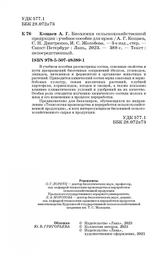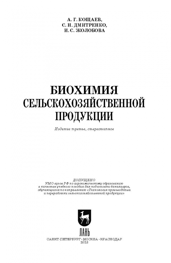 Кощаев, Дмитриенко, Жолобова: Биохимия сельскохозяйственной продукции. Учебное пособие