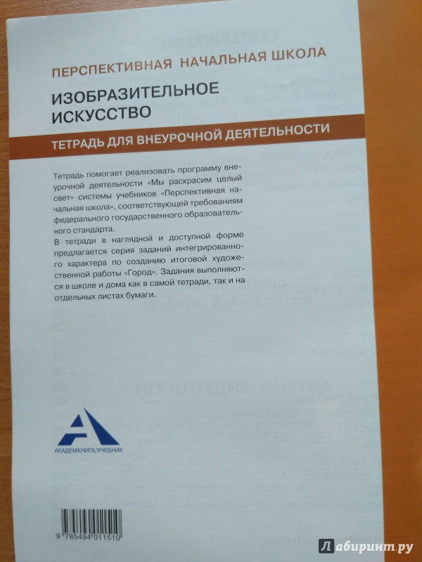 ОписаниеТетрадь помогает реализовать программу внеурочной деятельности "Мы раскрасим целый свет" системы учебников "Перспективная начальная школа", соответствующей требованиям федерального государственного образовательного стандарта. В тетради в наглядной и доступной форме предлагается серия заданий интегрированного характера по созданию итоговой художественной работы "Город". Задания выполняются в школе и дома как в самой тетради, так и на отдельных листах бумаги.2-е издание, стереотипноеТетрадь помогает реализовать программу внеурочной деятельности "Мы раскрасим целый свет" системы учебников "Перспективная начальная школа", соответствующей требованиям федерального государственного образовательного стандарта. В тетради в наглядной и доступной форме предлагается серия заданий интегрированного характера по созданию итоговой художественной работы "Город". Задания выполняются в школе и дома как в самой тетради, так и на отдельных листах бумаги.2-е издание, стереотипное