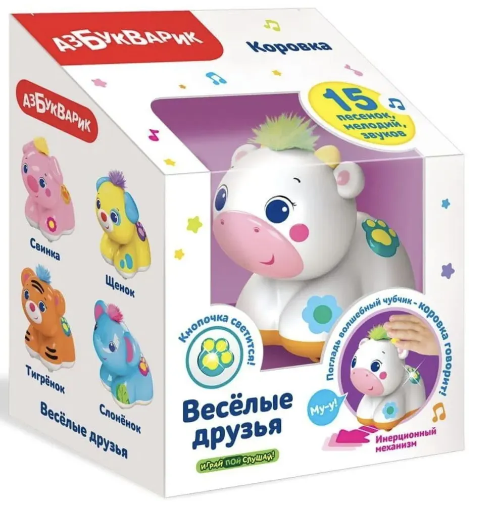 В игрушке также есть инерционный механизм – зверюшка ездит не хуже машинки.Соберите всю серию «Весёлые друзья»: коровку, свинку, щенка, слоненка и тигренка. Получится настоящая семья зверят с разноцветными чубчиками! В каждой игрушке – разные песенки, игры будут еще веселее!