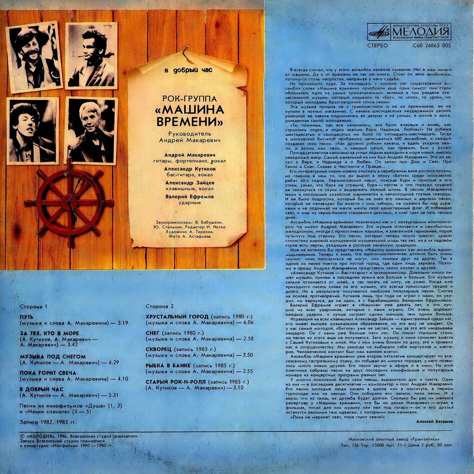 Жанр музыки Русский рок Страна СССР Год издания 1986 Исполнитель Машина времени Издатель МЕЛОДИЯ - Отзывы