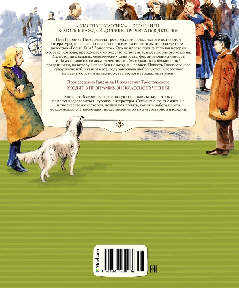 ОписаниеИмя Гавриила Николаевича Троепольского, классика отечественной литературы, неразрывно связано с его самым известным произведением – повестью «Белый Бим Чёрное ухо». Это не просто пронзительная история о собаке, которая, преодолевая множество испытаний, ищет любимого хозяина. Это история о важных человеческих ценностях, формирующих личность, и Бим становится символом честности, благородства и бесконечной преданности, на которую способен не каждый человек. Повесть Троепольского сразу после публикации в 1971 году завоевала любовь детей и взрослых из разных стран и до сих пор отзывается в сердцах читателей.