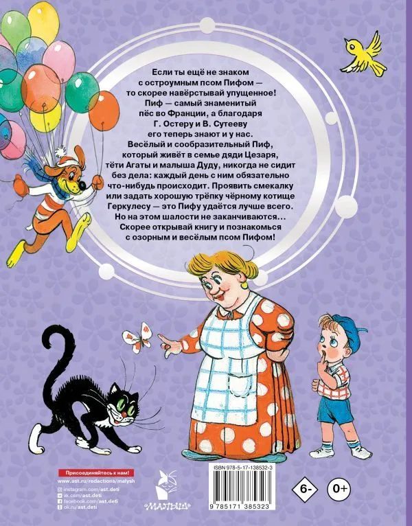 ОписаниеПёс Пиф появился во Франции в 1945 году. Его придумал художник и карикатурист Хосе Кабреро Арналь. Забавный Пиф стал главным персонажем комиксов, которые печатались в газетах и журналах. Вскоре истории про Пифа так полюбились французским читателям, что приобрели новый формат: их стали печатать отдельными книжками, снимать по ним мультфильмы, появились и театральные постановки.Сегодня истории про остроумного и изобретательного Пифа и его друзей - дядю Цезаря, тётю Агату, малыша Дуду и кота Геркулеса - для российских детей написал Григорий Бенционович Остер.Иллюстрации В. Сутеева.Для дошкольного возраста.