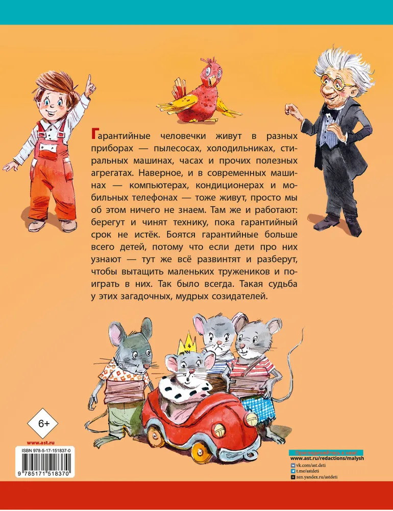 ОписаниеГарантийные человечки живут в разных приборах пылесосах, холодильниках, стиральных машинах, часах и прочих полезных агрегатах. Наверное, и в современных машинах компьютерах, кондиционерах и мобильных телефонах - тоже живут, просто мы об этом ничего не знаем. Там же и работают: берегут и чинят технику, пока гарантийный срок не истёк. Боятся гарантийные больше всего детей, потому что, если дети про них узнают, тут же всё развинтят и разберут, чтобы вытащить маленьких тружеников и поиграть в них. Так было всегда. Такая судьба у этих загадочных, мудрых созидателей.Для младшего школьного возраста.Гарантийные человечки живут в разных приборах пылесосах, холодильниках, стиральных машинах, часах и прочих полезных агрегатах. Наверное, и в современных машинах компьютерах, кондиционерах и мобильных телефонах - тоже живут, просто мы об этом ничего не знаем. Там же и работают: берегут и чинят технику, пока гарантийный срок не истёк. Боятся гарантийные больше всего детей, потому что, если дети про них узнают тут же всё развинтят и разберут, чтобы вытащить маленьких тружеников и поиграть в них. Так было всегда. Такая судьба у этих загадочных, мудрых созидателей.