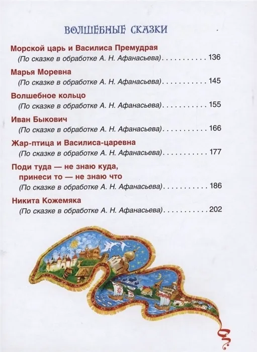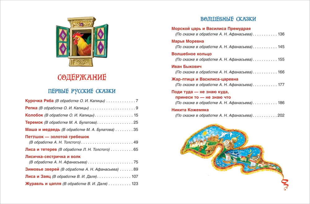 В сборник вошли известные русские сказки — от «Теремка» и «Колобка» до «Марьи Моревны» и «Волшебного