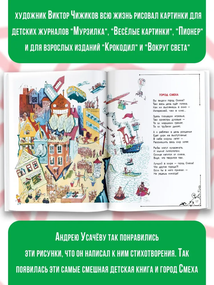 ОписаниеКнига "Город Смеха" — одна из самых необычных детских книг. Художник Виктор Чижиков всю жизнь рисовал картинки для детских журналов "Мурзилка", "Весёлые картинки", "Пионер" и для взрослых изданий "Крокодил" и "Вокруг света". Андрею Усачёву так понравились эти рисунки, что он написал к ним стихотворения. Так появилась эта самые смешная детская книга и город Смеха, который ждёт новых жителей. Каких жителей? Вас, читатели и юные слушатели книг!