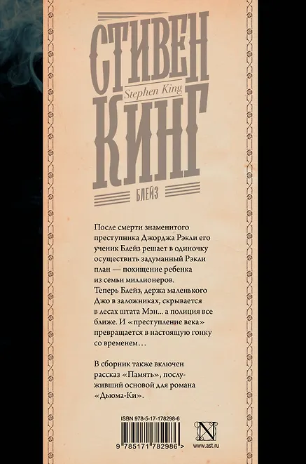 ОписаниеПосле смерти знаменитого преступника Джорджа Рэкли его ученик Блейз решает в одиночку осуществить задуманный Рэкли план — похищение ребенка из семьи миллионеров.Теперь Блейз, держа маленького Джо в заложниках, скрывается в лесах штата Мэн... а полиция все ближе.И "преступление века" превращается в настоящую гонку со временем.В сборник также включен рассказ "Память", послуживший основой для романа "Дьюма-Ки".