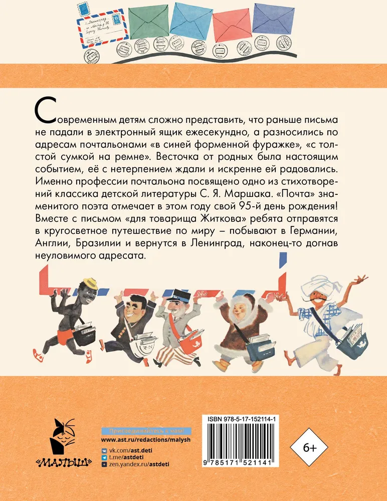 ОписаниеСовременным детям сложно представить, что раньше письма не падали в электронный ящик, а разносились по адресам почтальонами "в синей форменной фуражке", "с толстой сумкой на ремне". Весточка от родных была настоящим событием, её с нетерпением ждали и искренне ей радовались. Именно профессии почтальона посвящено одно из стихотворений классика детской литературы С. Я. Маршака. "Почта" знаменитого поэта отмечает в этом году свой 95-й день рождения! Вместе с письмом "для товарища Житкова" ребята отправятся в кругосветное путешествие по миру - побывают в Германии, Англии, Бразилии и вернутся в Ленинград, наконец-то догнав неуловимого адресата. Помимо "Почты", в сборник вошли и другие произведения знаменитого поэта - стихотворения, сказки и повести в стихах: "Мастер-ломастер", "Вакса-Клякса", "Отчего кошку назвали кошкой", "Старуха, дверь закрой!", "Рассказ о неизвестном герое", "Мистер Твистер" и многие другие.